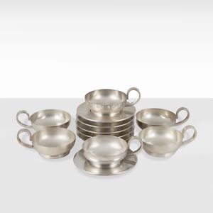 6x12,5 cm. Italia, anni 30-40 sei tazzine da caffè con piattini in metallo argentato, marchio della produzione
