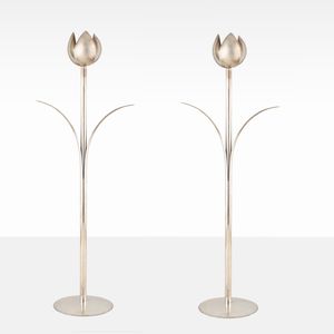 h. 56 cm. Italia, anni 80 coppia di candelieri in metallo argentato, marchio della produzione