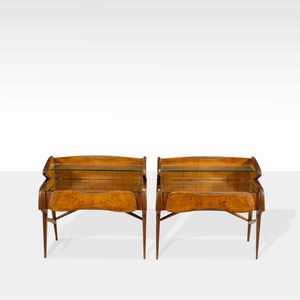 60x55x36 cm. Italia, anni 50 coppia di comodini in legno, vetro trasparente ed ottone