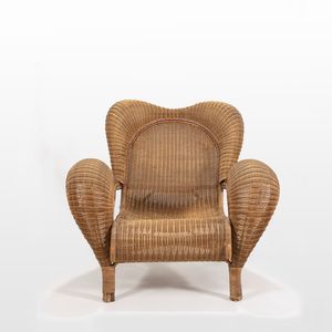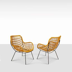 82x65x60 cm. italia, anni 50 coppia di poltrone in midollino, bambù e metallo verniciato, lievi difetti