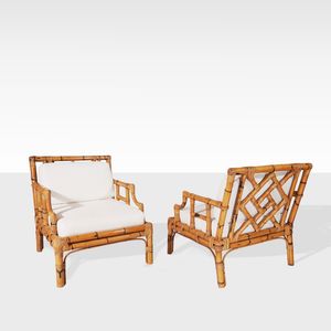 77x67x80 cm. Italia, anni 70 coppia di poltrone in bambù, midollino e tessuto imbottito