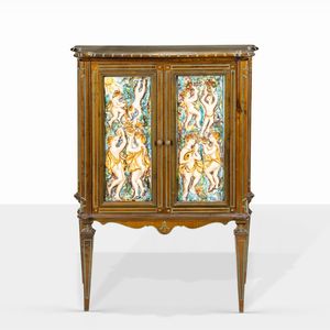 114x86x44 cm. anni 60 credenza in legno e ceramica policroma, lievi usure