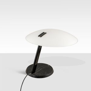 38x52 cm. Italia, anni 70 lampada da tavolo mod. Perla in metallo verniciato, vetro opalino e base in marmo, etichetta [..]