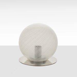26x24 cm. Murano, anni 70 lampada da tavolo in vetro soffiato trasparente a mezza filigrana lattimo e base in [..]