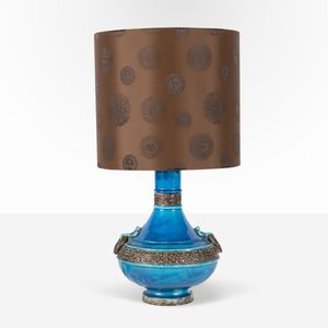 70x36 cm. Italia, anni 60 lampada da tavolo in ceramica policroma, completa di paralume in tessuto Fornasetti, [..]