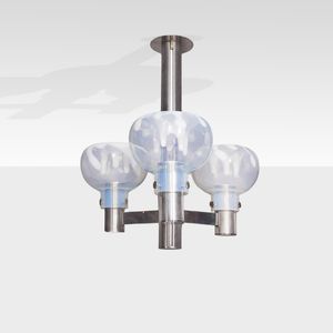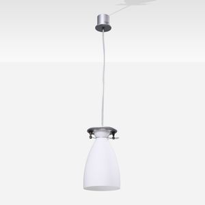 45x40 cm. Italia, 1961 lampada a sospensione mod. Omega in acciaio satinato e vetro opalino. Bibliografia: G. [..]