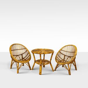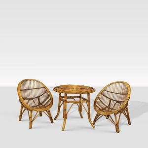 anni 60-70 salotto in bambù, lievi difetti, composto da: un tavolino 70x80 cm. 2 poltrone 84x66x70 cm. cad.