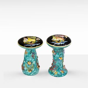45x29 cm. cad. Vietri, anni 60 coppia di sgabelli in ceramica policroma, lievi difetti
