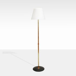 h. 186 cm. anni 60-70 lampada da terra in ottone e base in legno, completa di paralumi