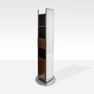 h. 200 cm. anni 90 mobile contenitore girevole in legno, metallo, pelle, vetro specchiato e opalino, lievi usu [..]
