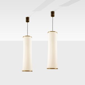 h. 120 cm. anni 60-70 coppia di lampade a sospensione in ottone e tessuto, usure