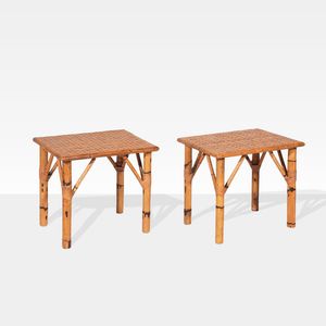 43x46x36 cm. anni 70 coppia di tavolini bassi in rattan, midollino e bambù, lievi usure
