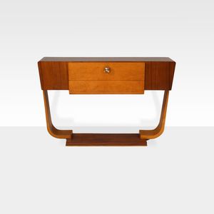 80x118x28,5 cm. anni 40 console in legno, ottone e plexiglass, lievi usure