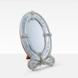 54x32 cm. Murano, anni 50 specchio da tavolo in legno, vetro specchiato e trasparente, mancanza