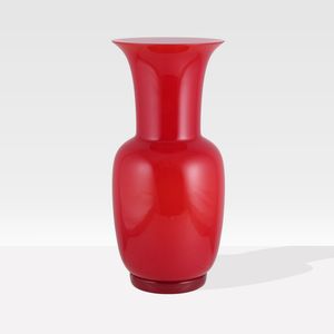 h. 36,5 cm. Murano, 2018 vaso serie Opalino in vetro soffiato rosso, firma e data a punta, etichetta della pro [..]