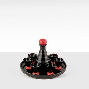 Murano, anni 40-50 set da rosolio in vetro incamiciato nero e rosso, composto da: un vassoio circolare d. 23 cm. [..]