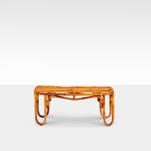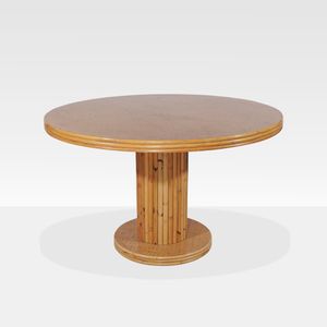 75x122 cm. anni 70 tavolo circolare in midollino e bambù, lievi usure