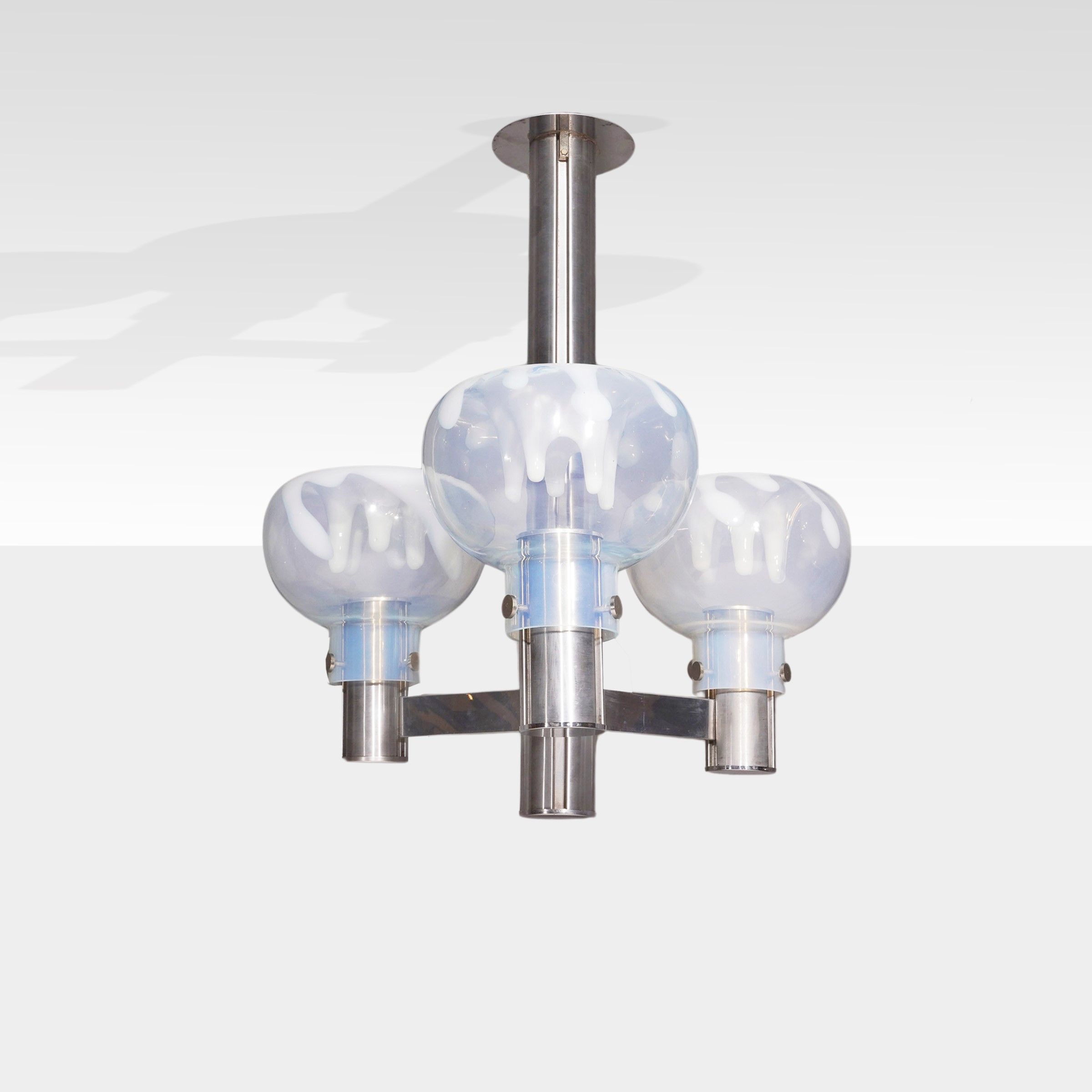 Murano, anni 70 lampada a sospensione in alluminio satinato, vetro trasparente e vetro opalino