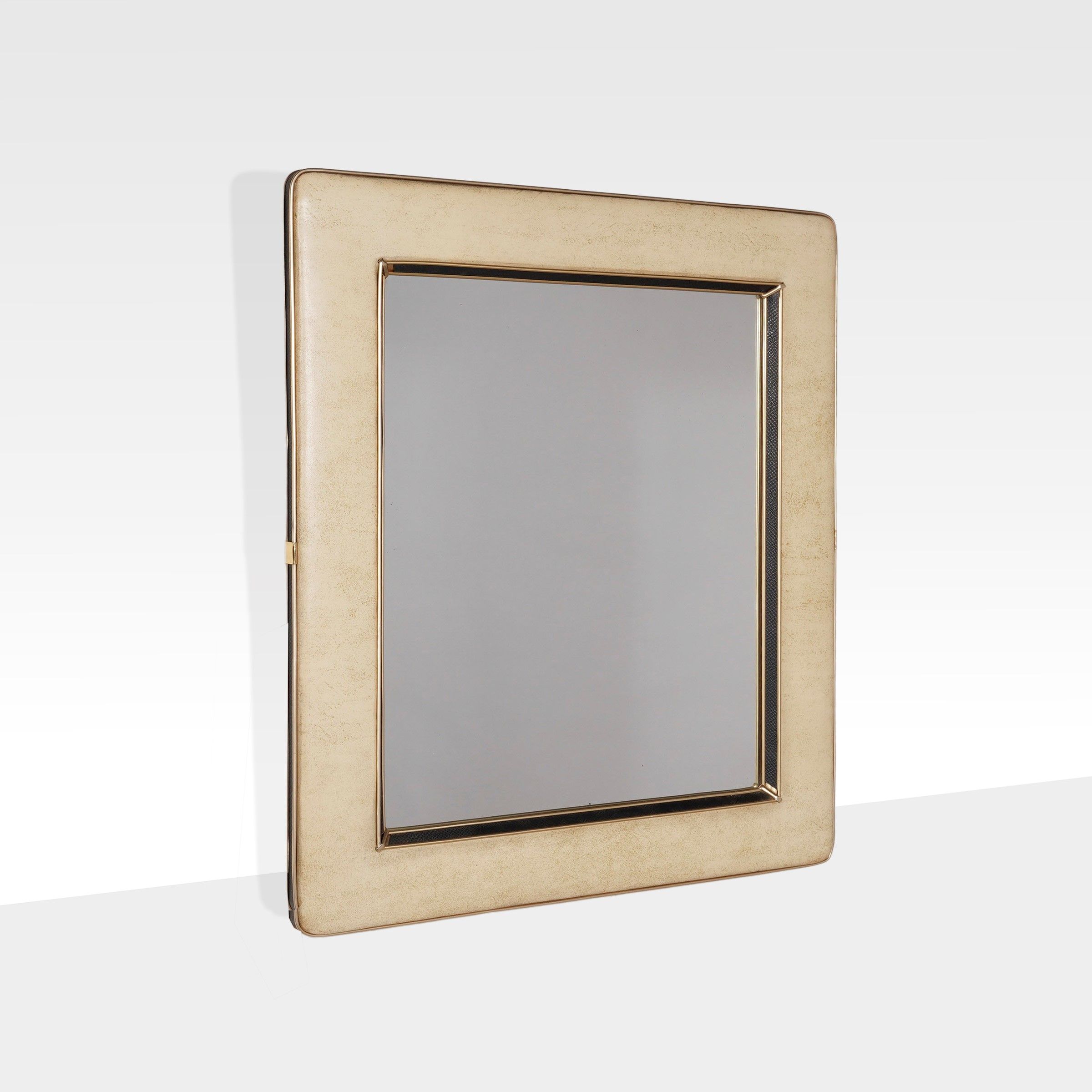 Italia, anni 50 specchio da parete in vetro specchiato, pelle vinilica, similpelle e metallo dorato, lievi usure