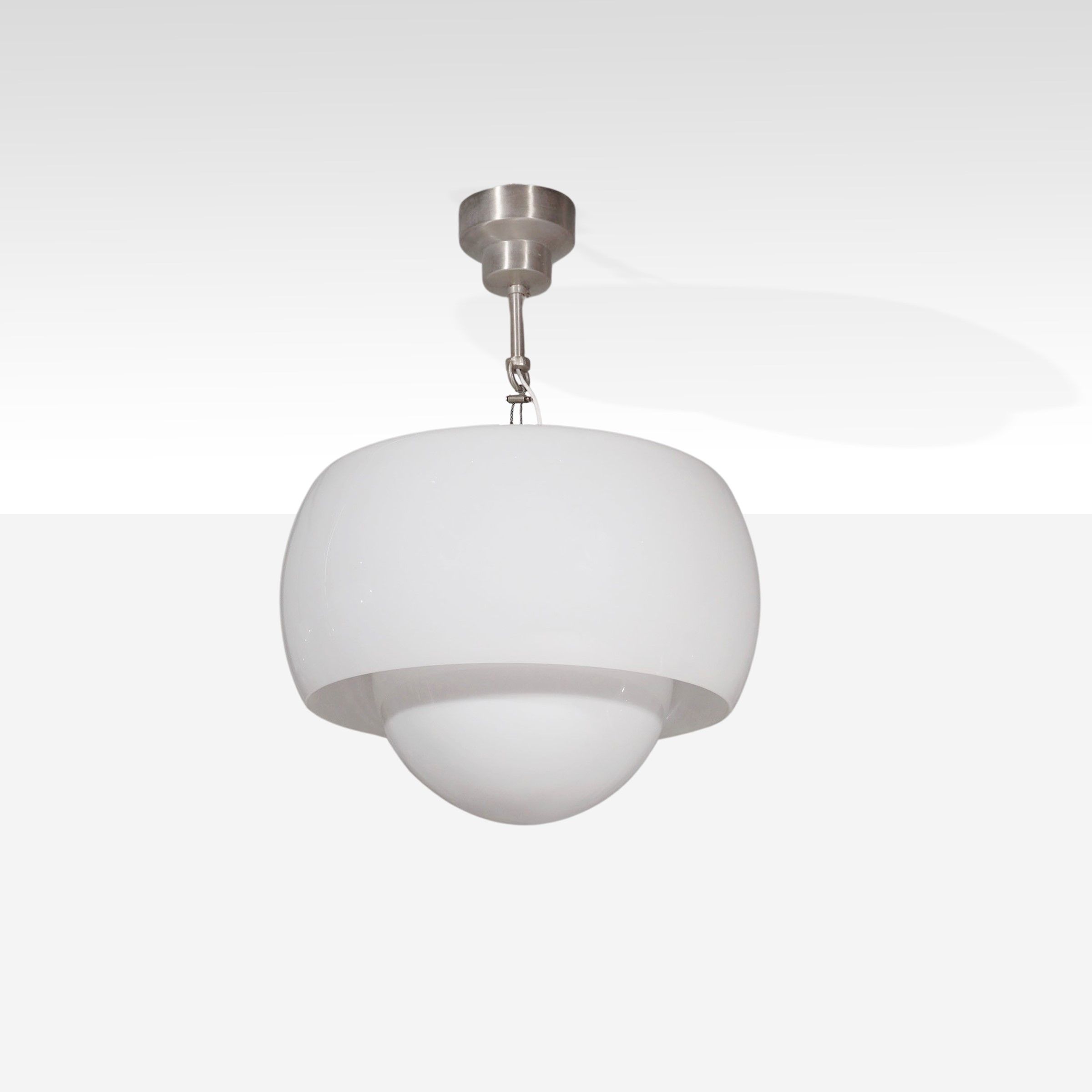 Italia, 1961 lampada a sospensione mod. Omega in acciaio satinato e vetro opalino. Bibliografia: G. Gramigna, Repertorio del design italiano 1950-2000 per l'arredamento domestico, Allemandi, Torino 2021, pag. 91