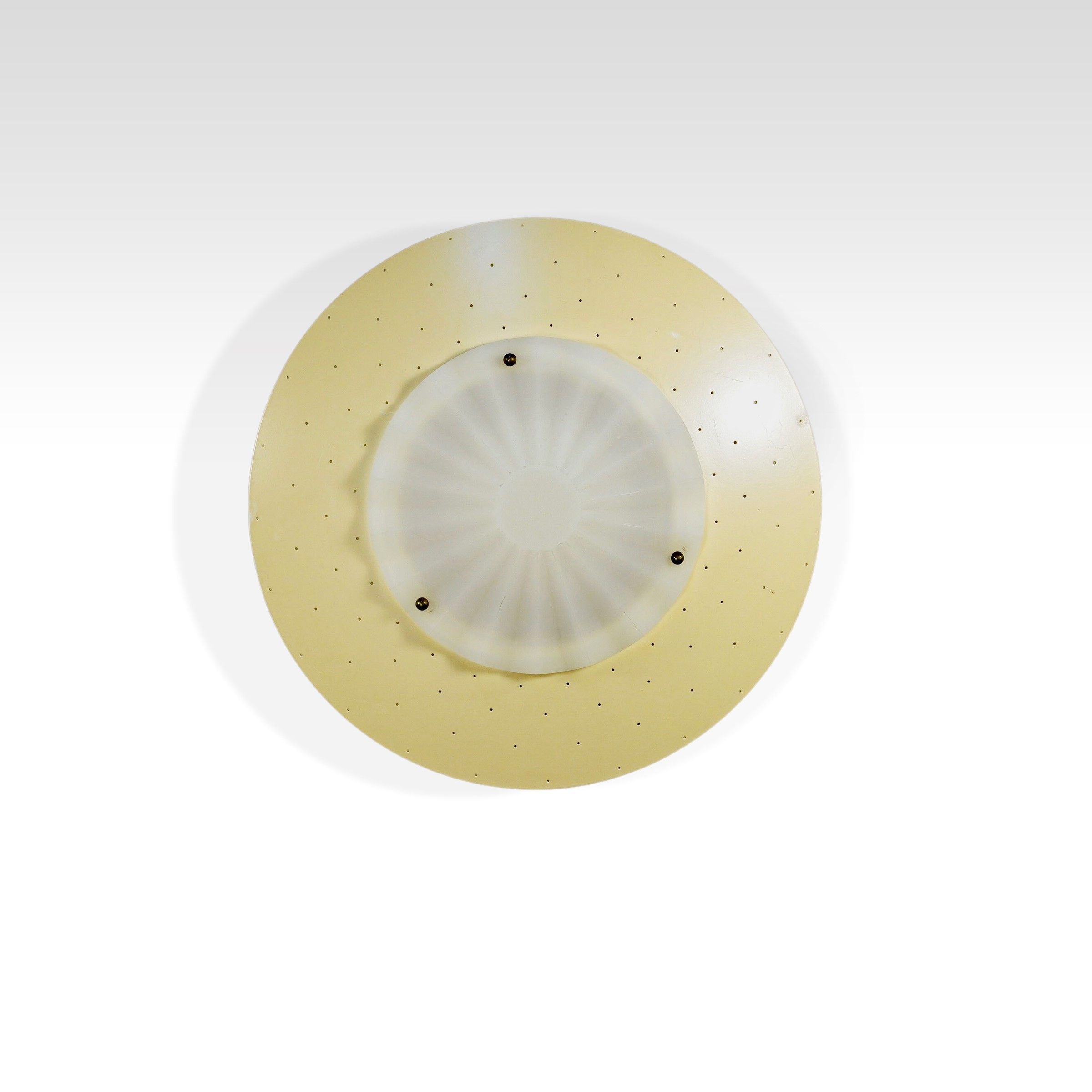 Italia, anni 60 lampada da parete o soffitto serie Migale in metallo verniciato e vetro satinato, etichetta della produzione, lievi usure