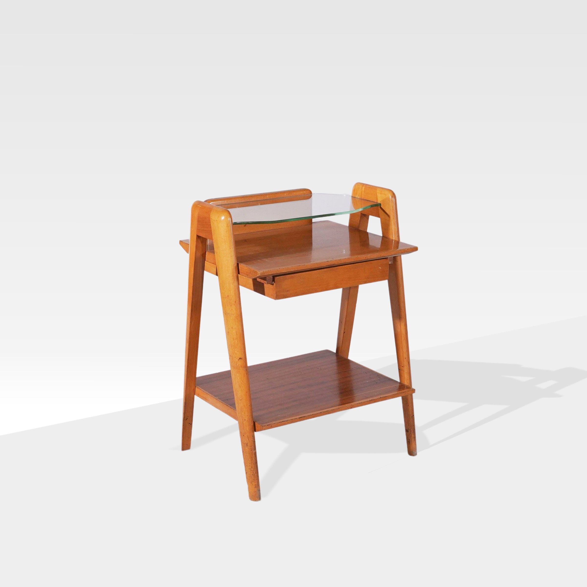 Italia, anni 50 comodino in legno e vetro trasparente, lievi usure
