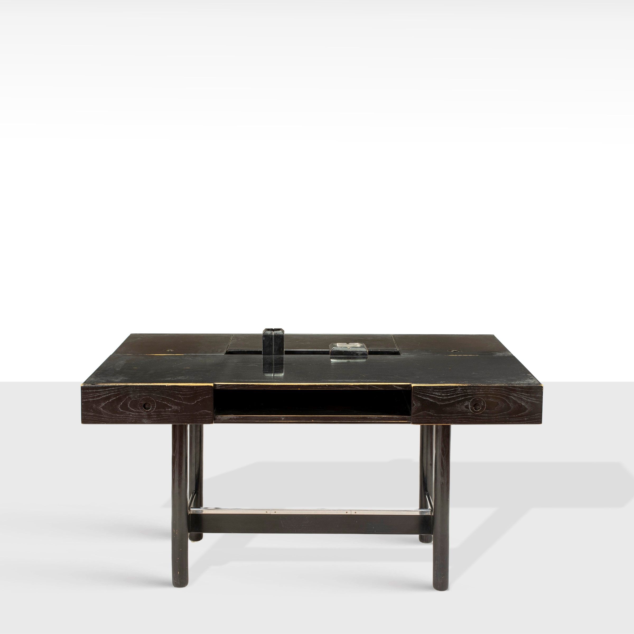 Italia, anni 60 scrivania in legno ebanizzato e metallo, usure