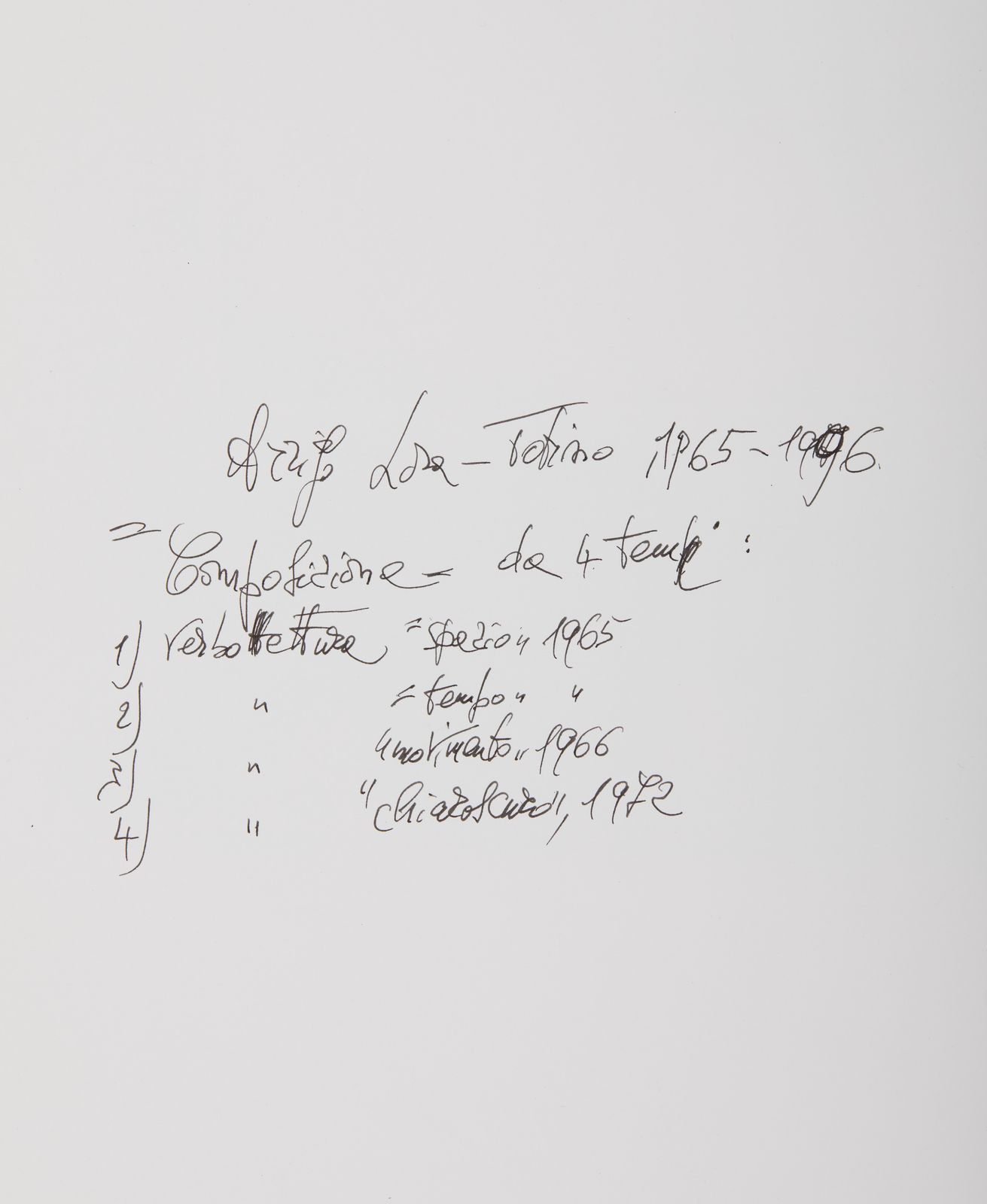 firma, data, titolo e dedica ad personamL'opera è un collage composto da quattro opere già realizzate dallo stesso artista:Verbotettura 'spazio', 1965. Verbotettura 'tempo', 1965. Verbotettura 'movimento', 1966. Verbotettura 'chiaroscuro', 1972PROVENIENZAEredi Lora Totino, CuneoCollezione privata, Milano
