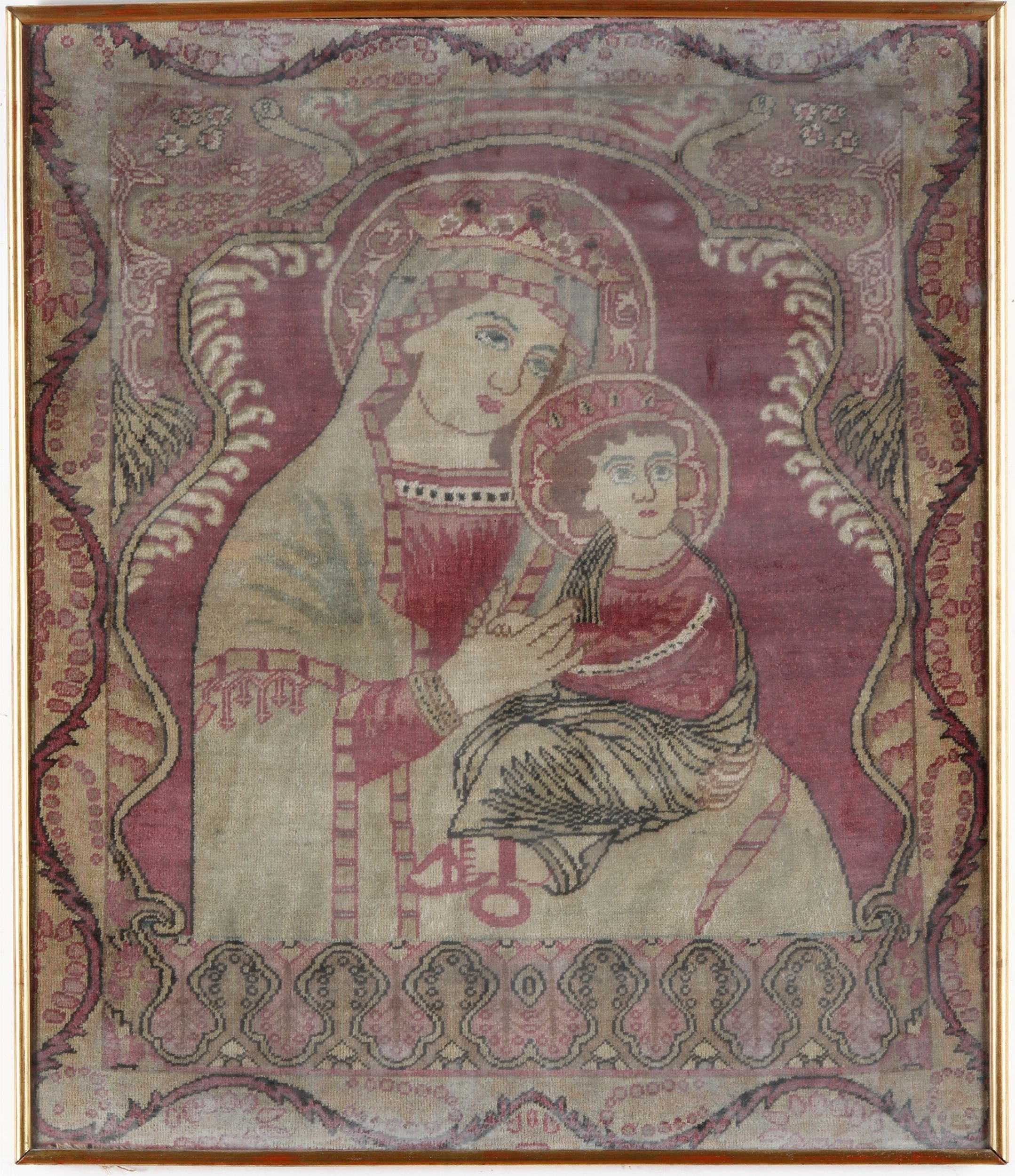 Tessuto raffigurante Madonna con Bambino, in cornice