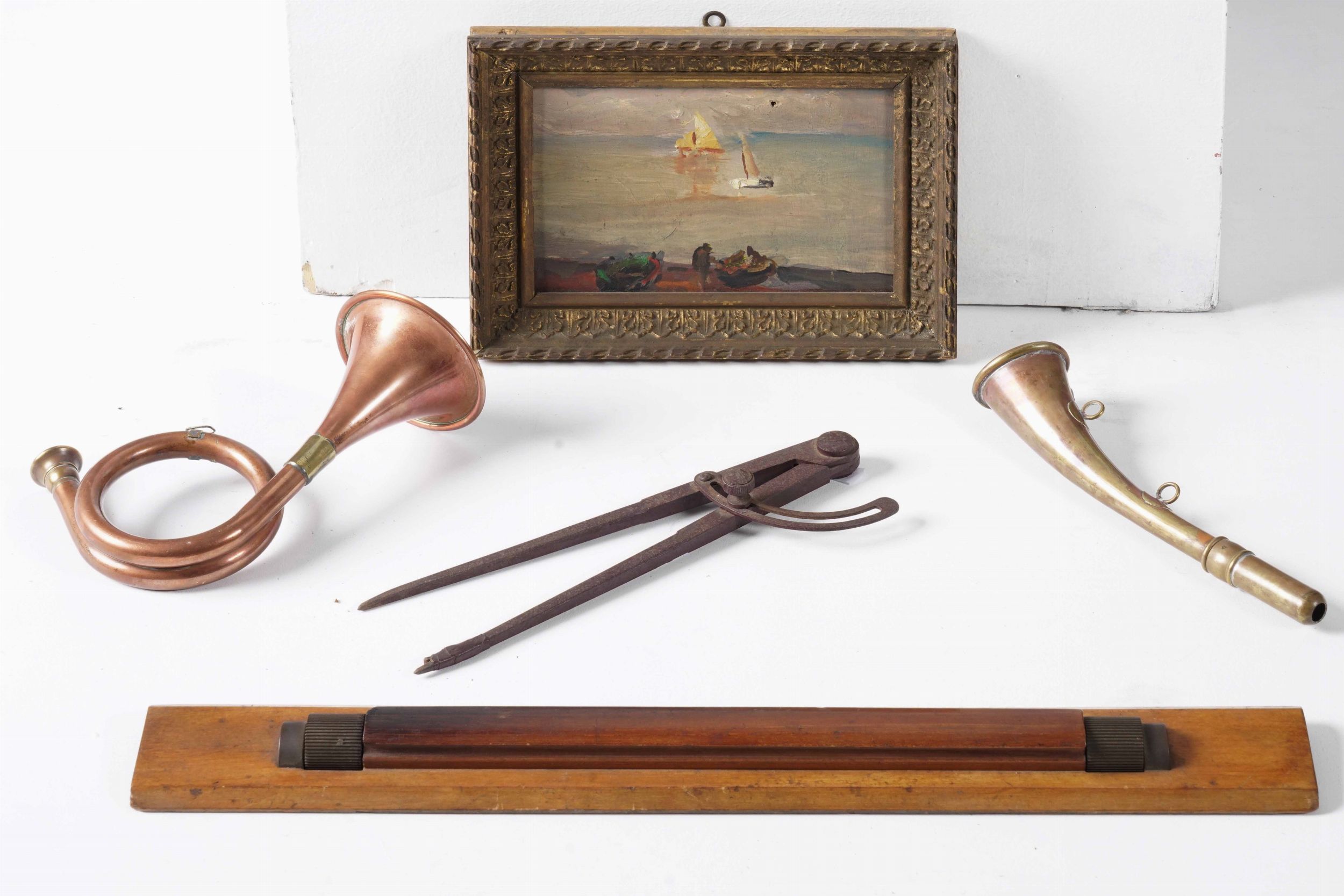 Due piccoli corni in rame, un compasso, uno strumento da misurazione e un piccolo [..]