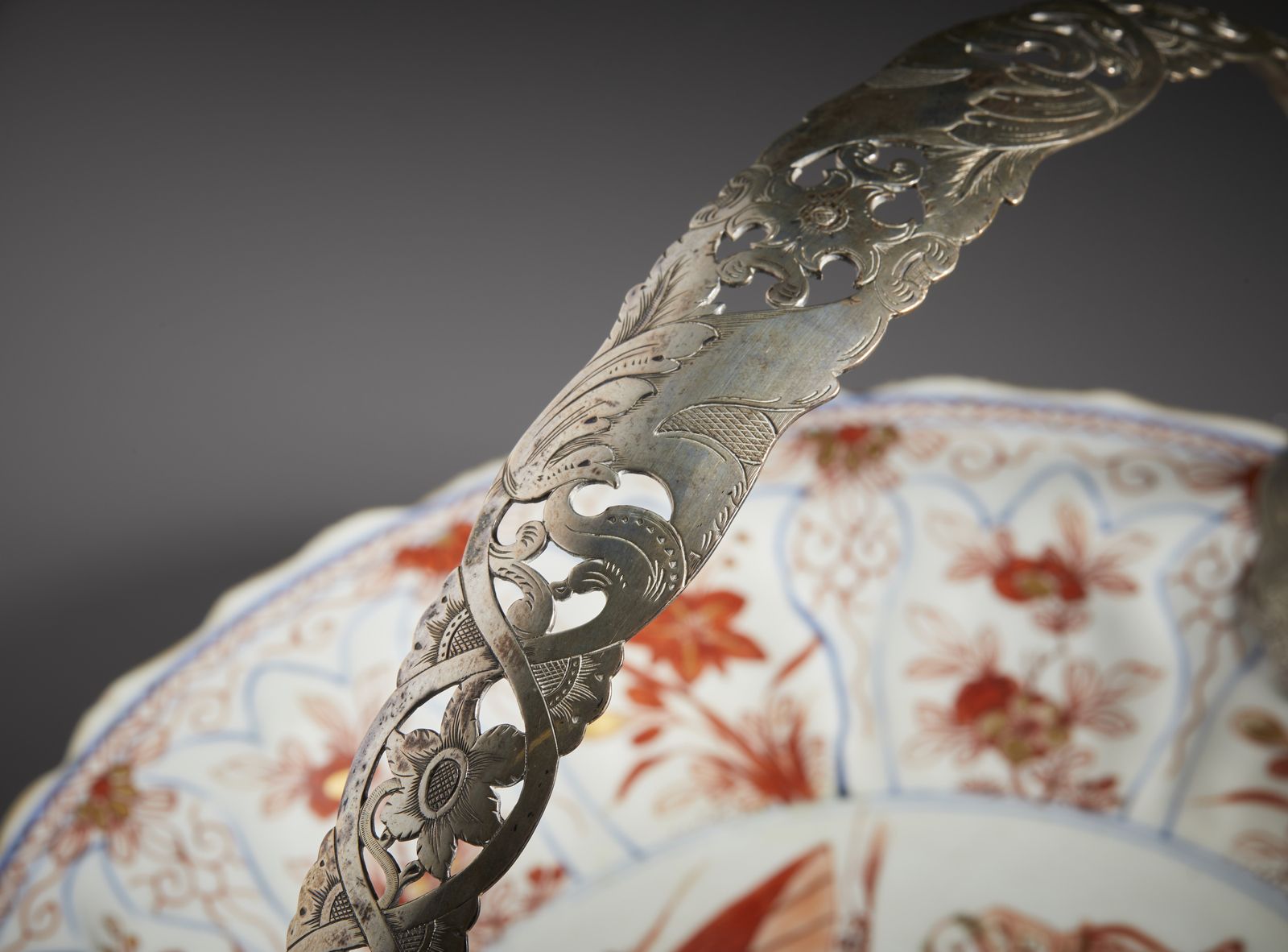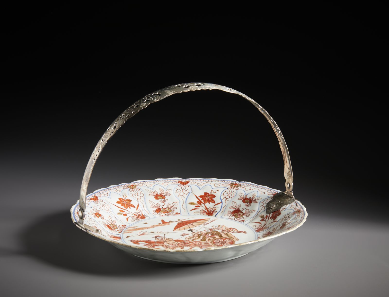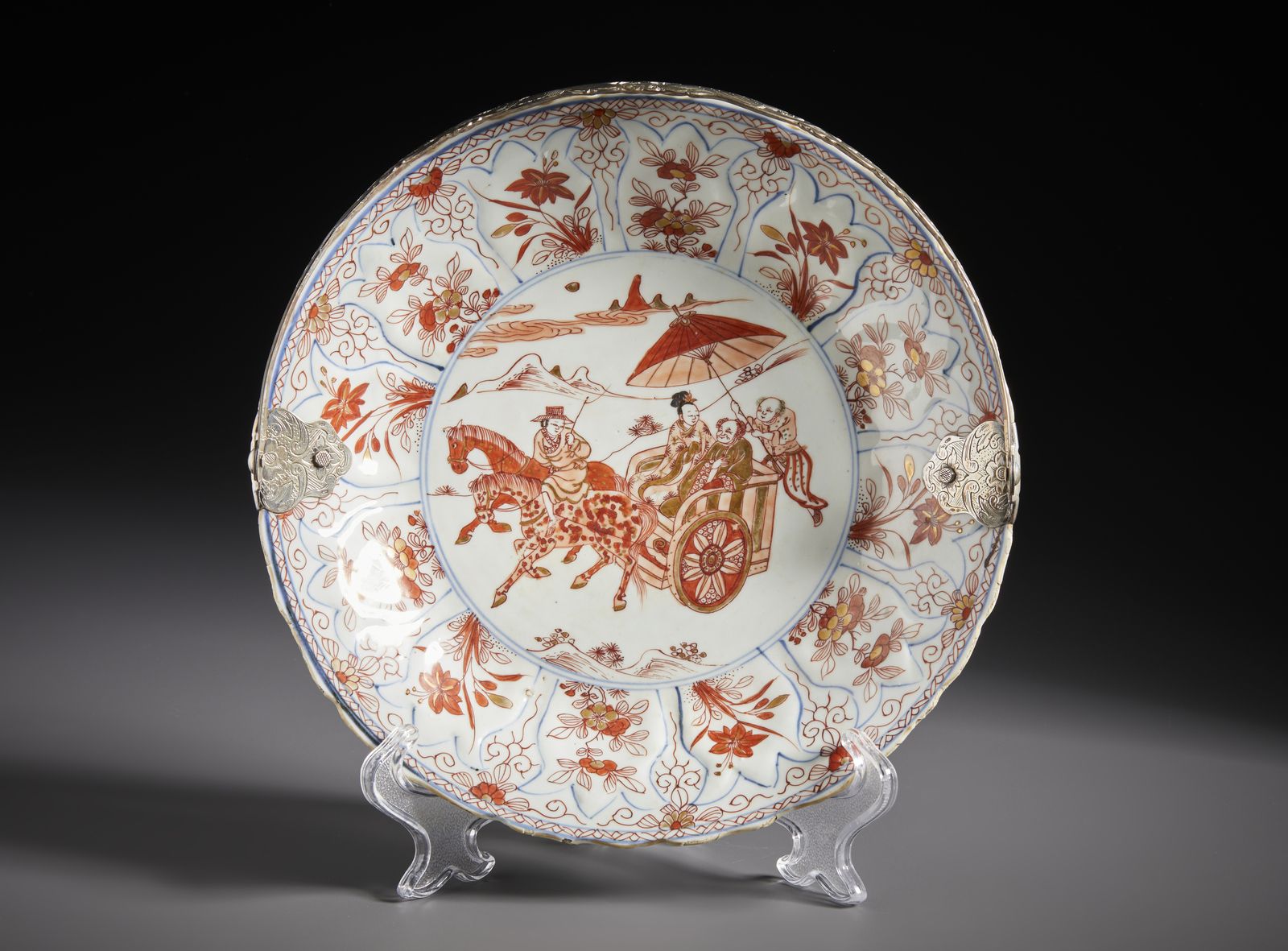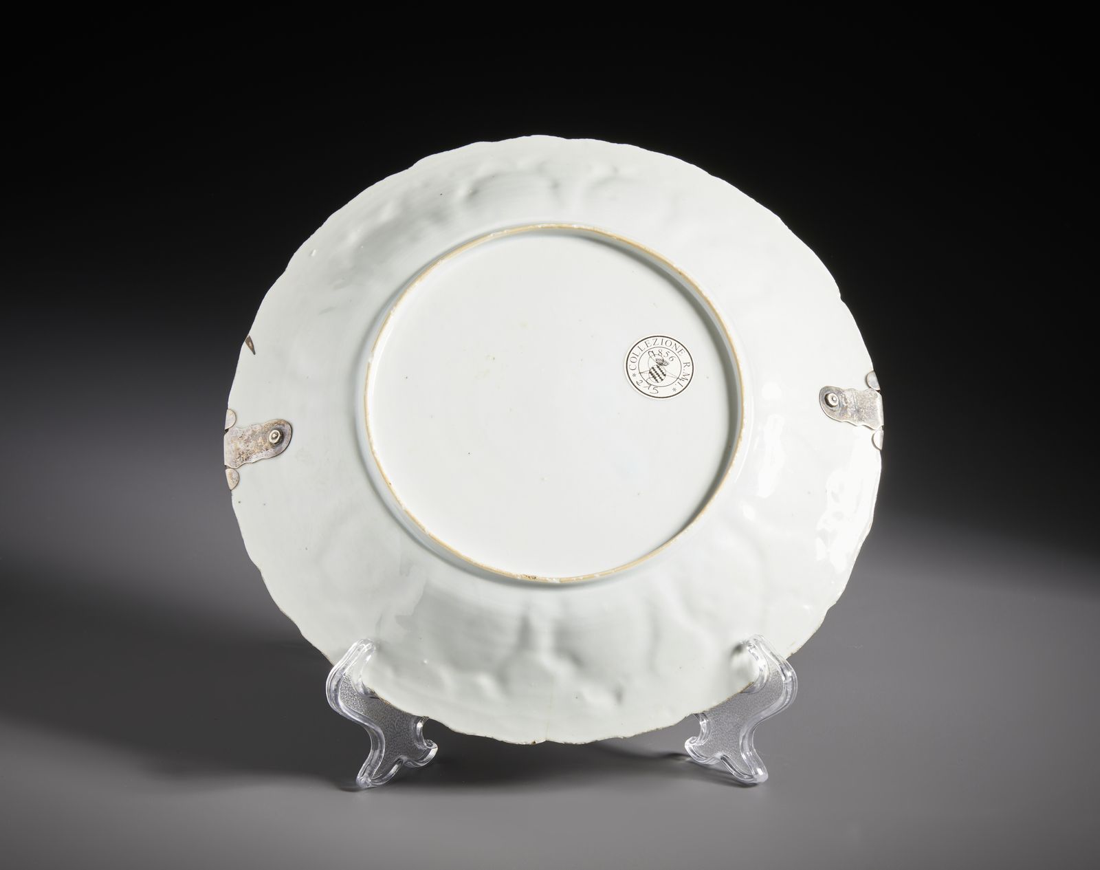 Il centro è dipinto con due personaggi su di un calesse trainato da due cavalli. un servitore li ripara con un grande parasole. La tesa del piatto è modellata a motivi di corolle o melograni con riserve a motivi floreali. Montato in argento posteriormente.