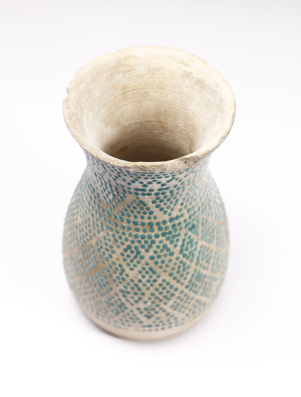 Bricco in ceramica con ansa singola, l'esterno decorato con raggruppamenti romboidali di piccoli punti di vetrina turchese in rilievo.