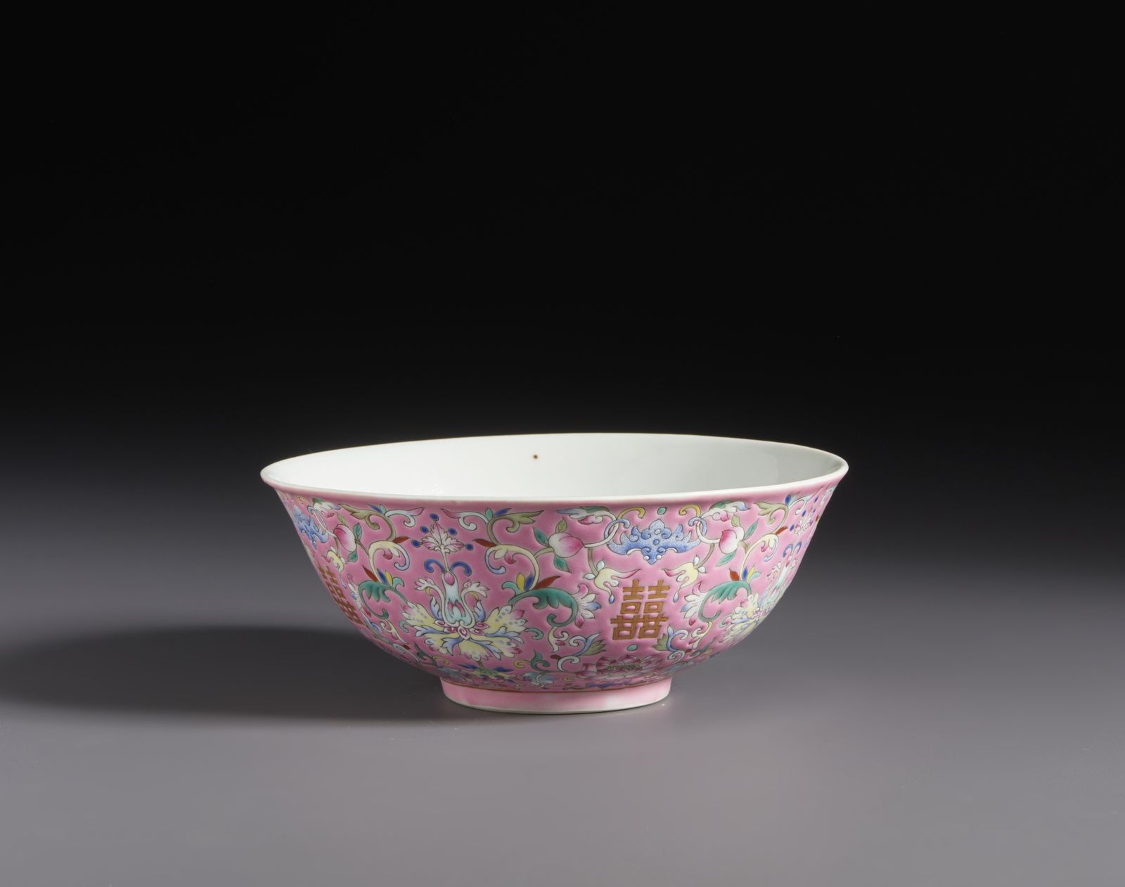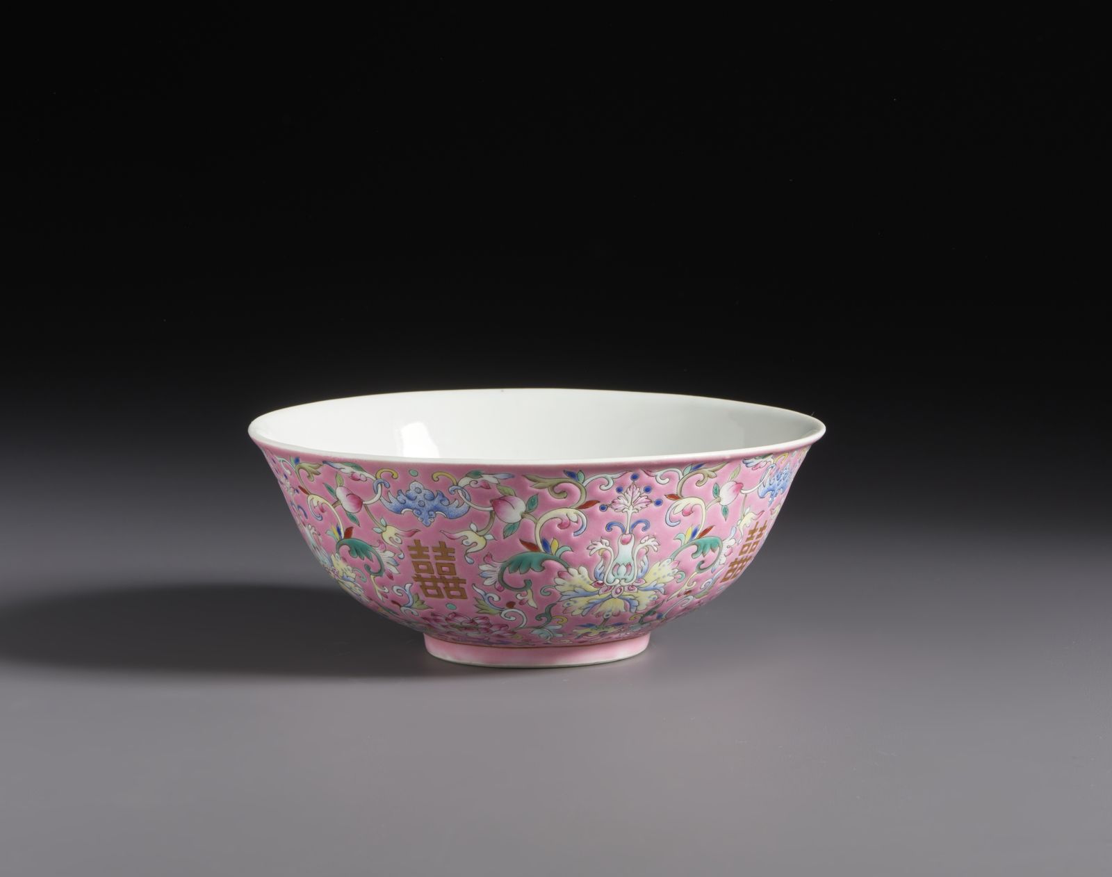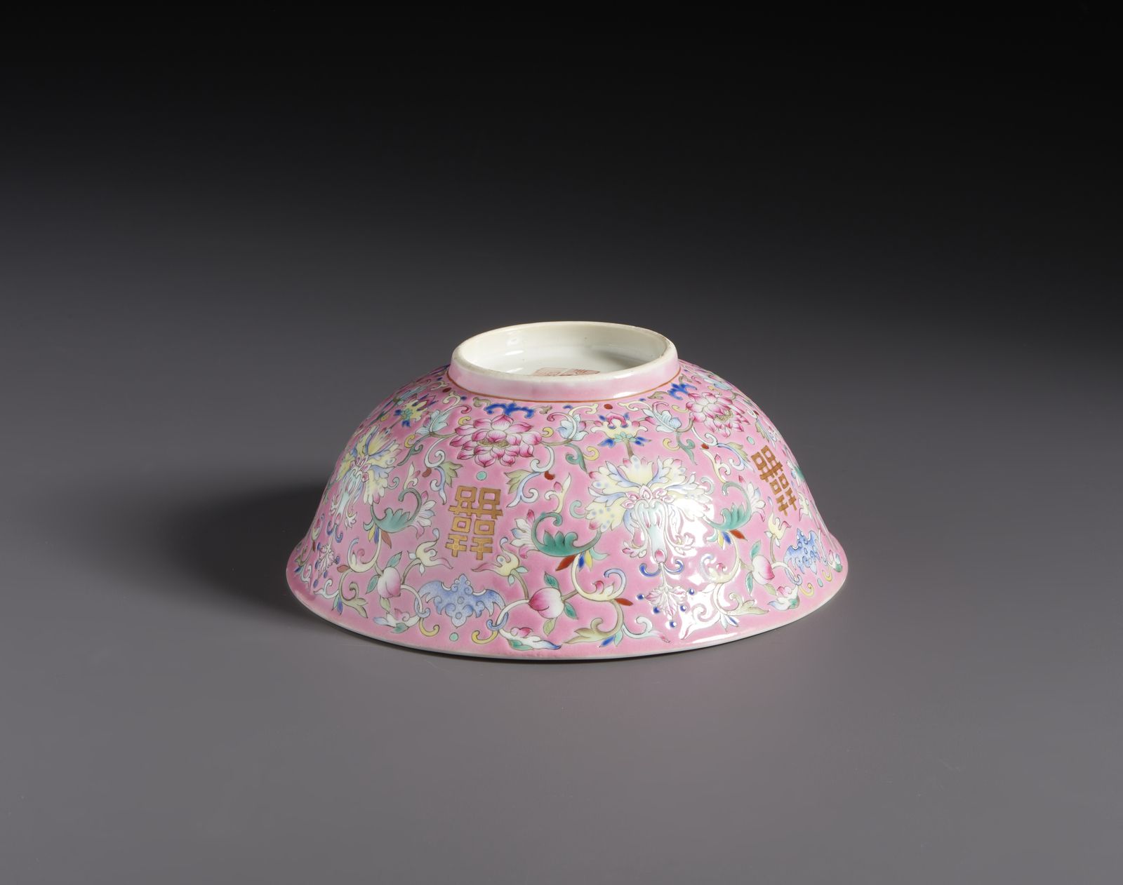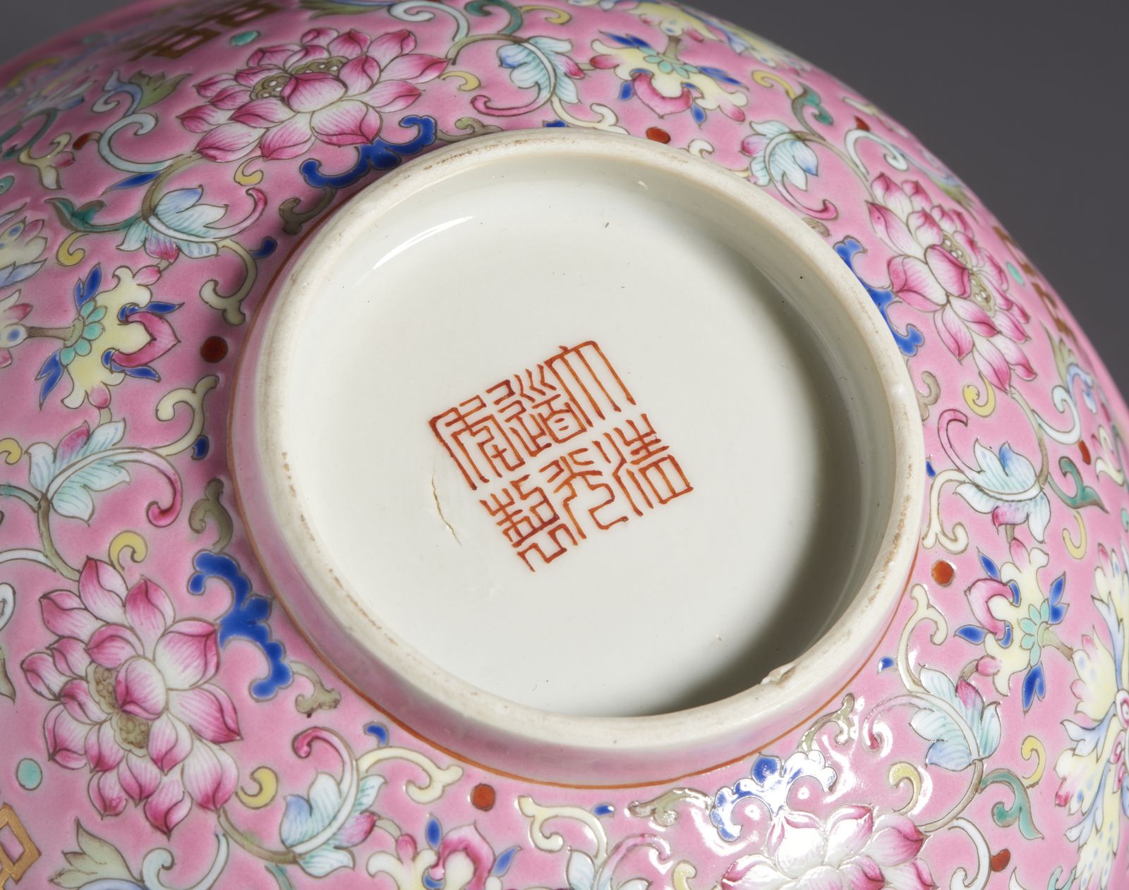 con decoro di fiori di loto alternati a simboli di buon auspicio su uno sfondo rosa.Alla base reca il marchio apocrifo di Tao Kuang.