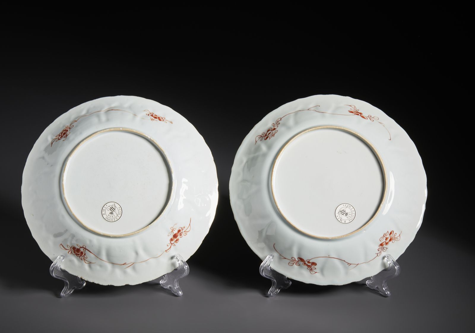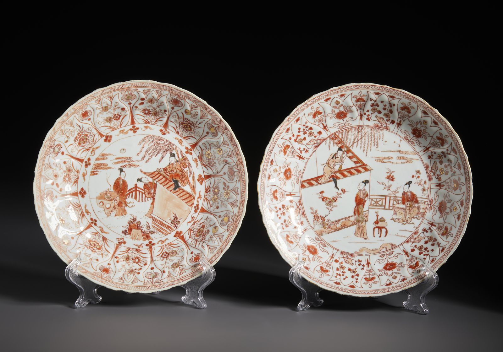 Due bei piatti in porcellana decorati in rosso ferro ed oro raffiguranti al centro [..]