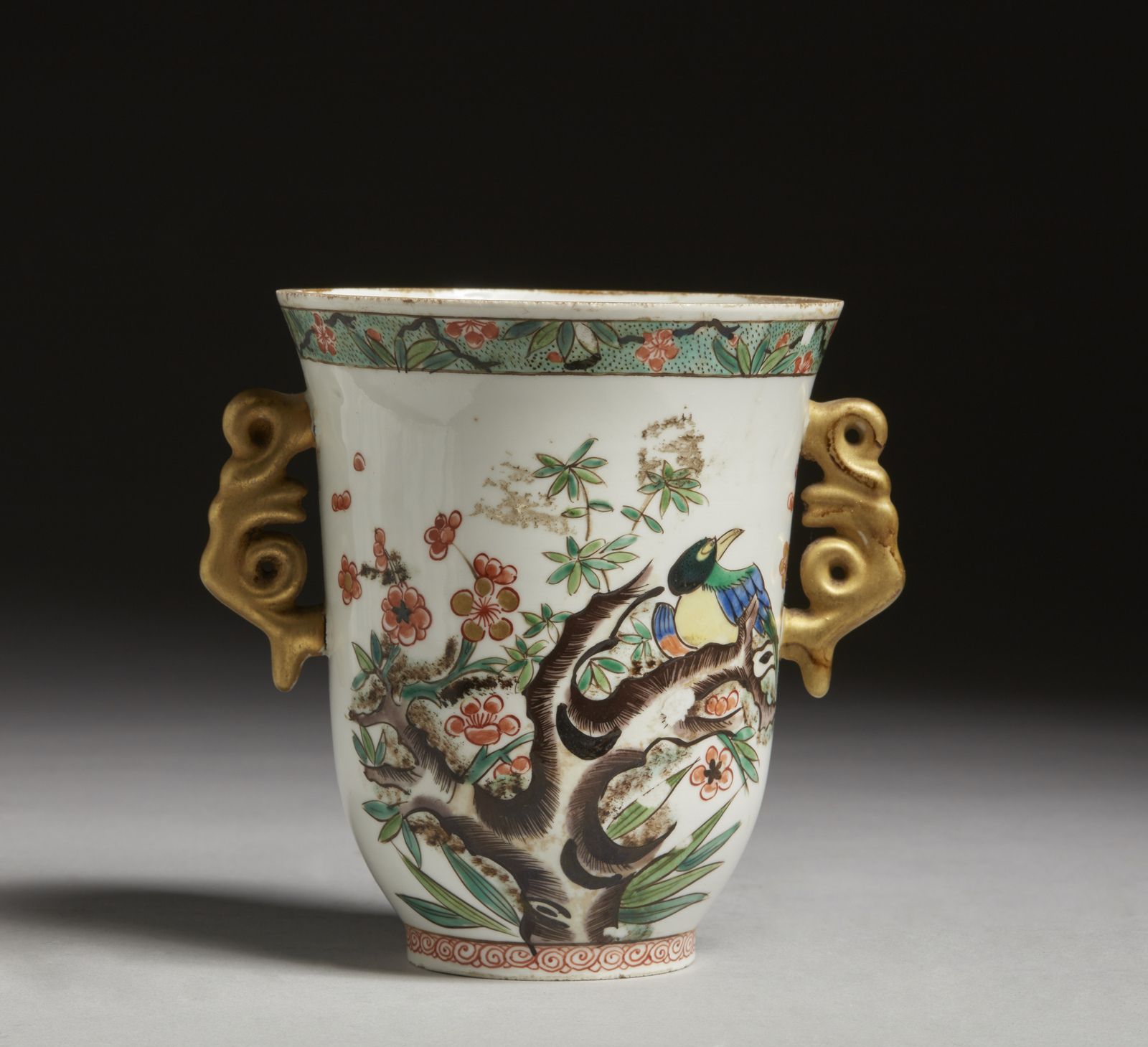Smaltate con uccelli e decori floreali, la potiche di epoca transizione ed il bicchiere, attribuibile all'epoca Kangxi, mostra gli orli tagliati. Il più grande ha le misure indicate.