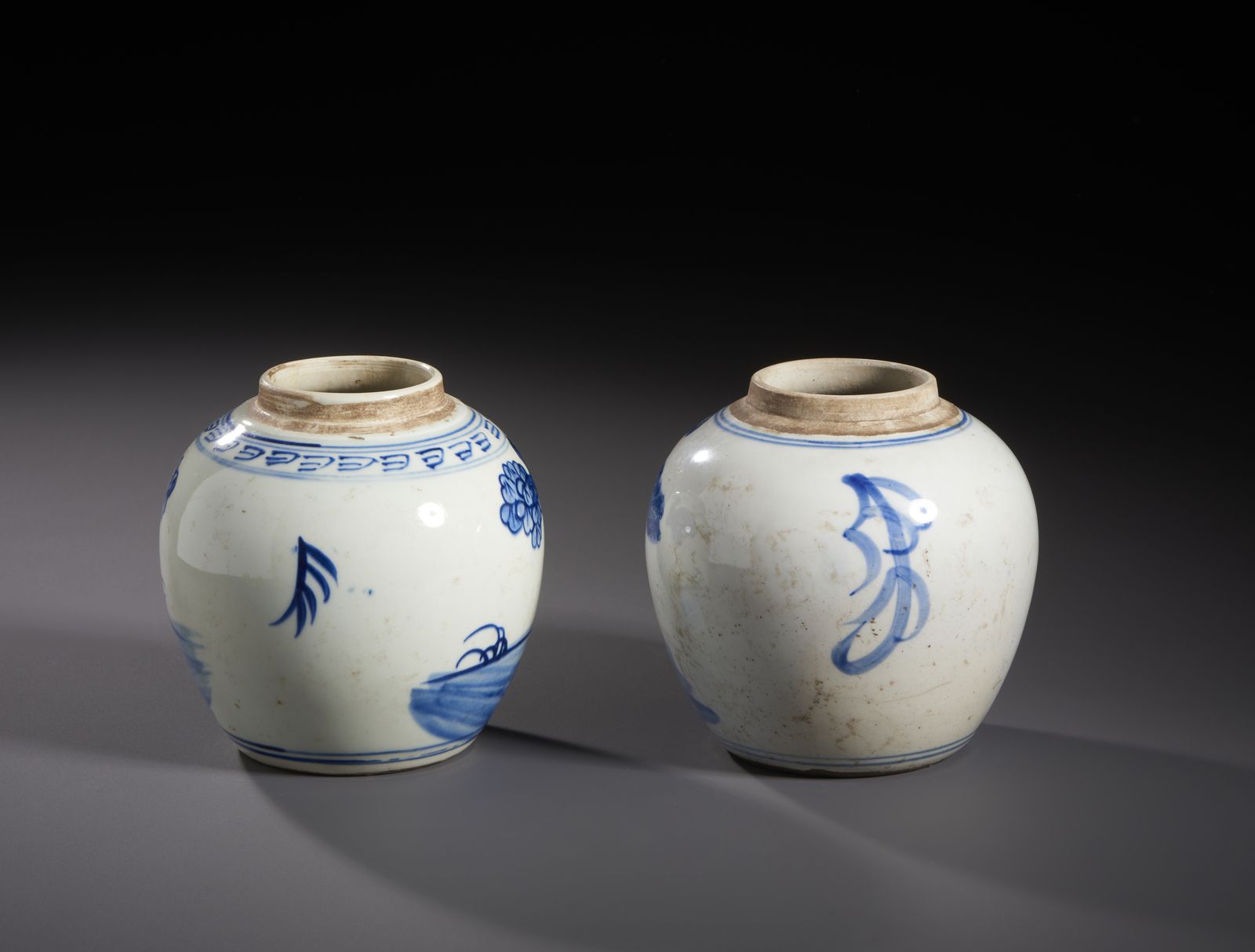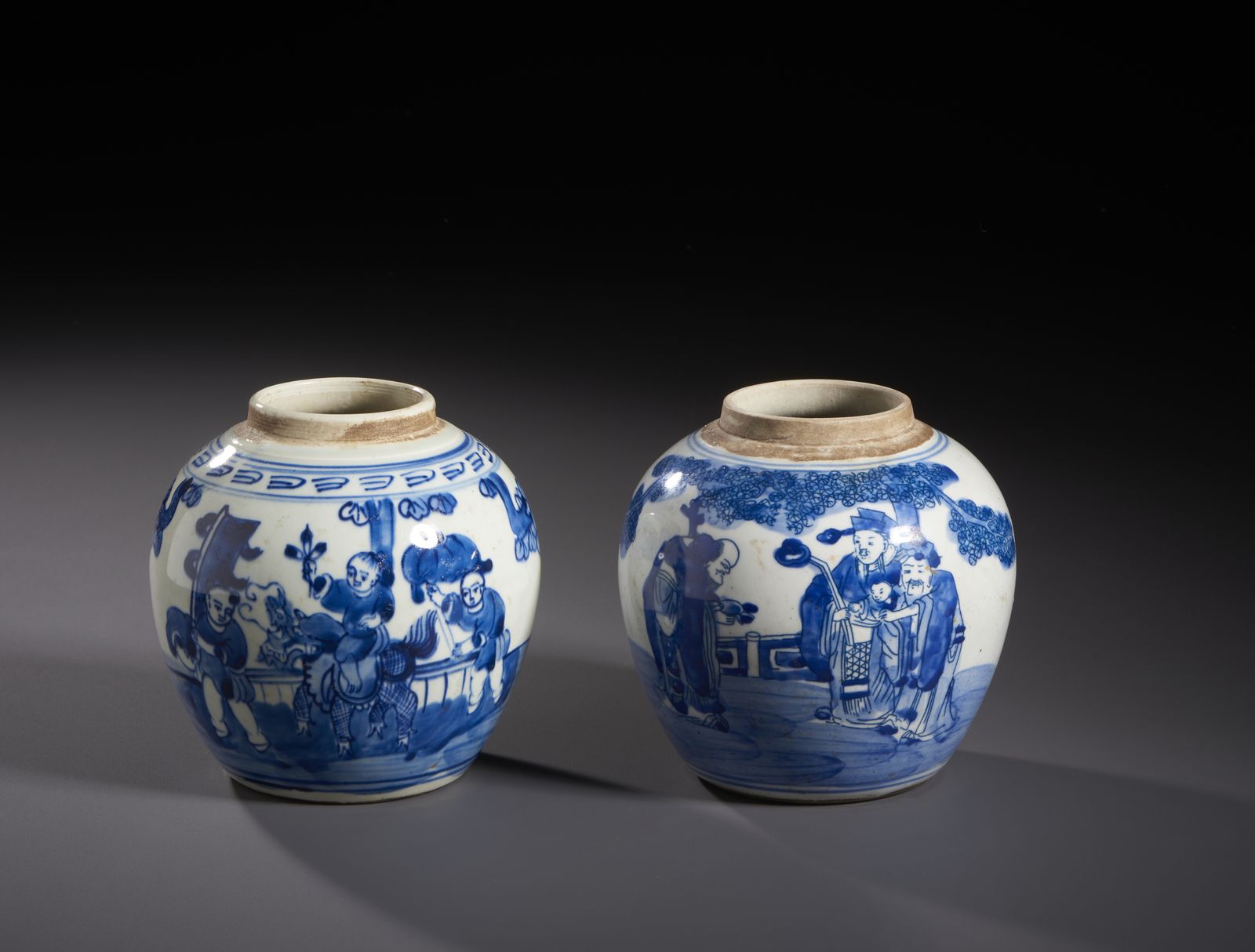 Due piccole ginger jar in porcellana bianco e blu dipinta con bimbi che giocano [..]
