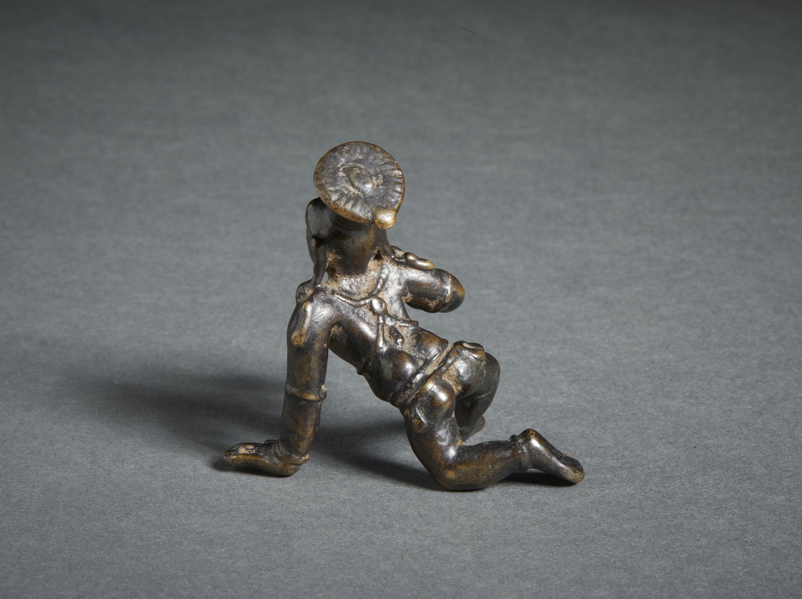Bella fusione a patina scura raffigurante la divinità bambino, a carponi. La figura porta il copricapo caratteristico di questa tipologia di bronzi provenienti dal Tamil Nadu. Belli i dettagli dei gioielli e del finale del copricapo. Provenienza: Collezione Berger.