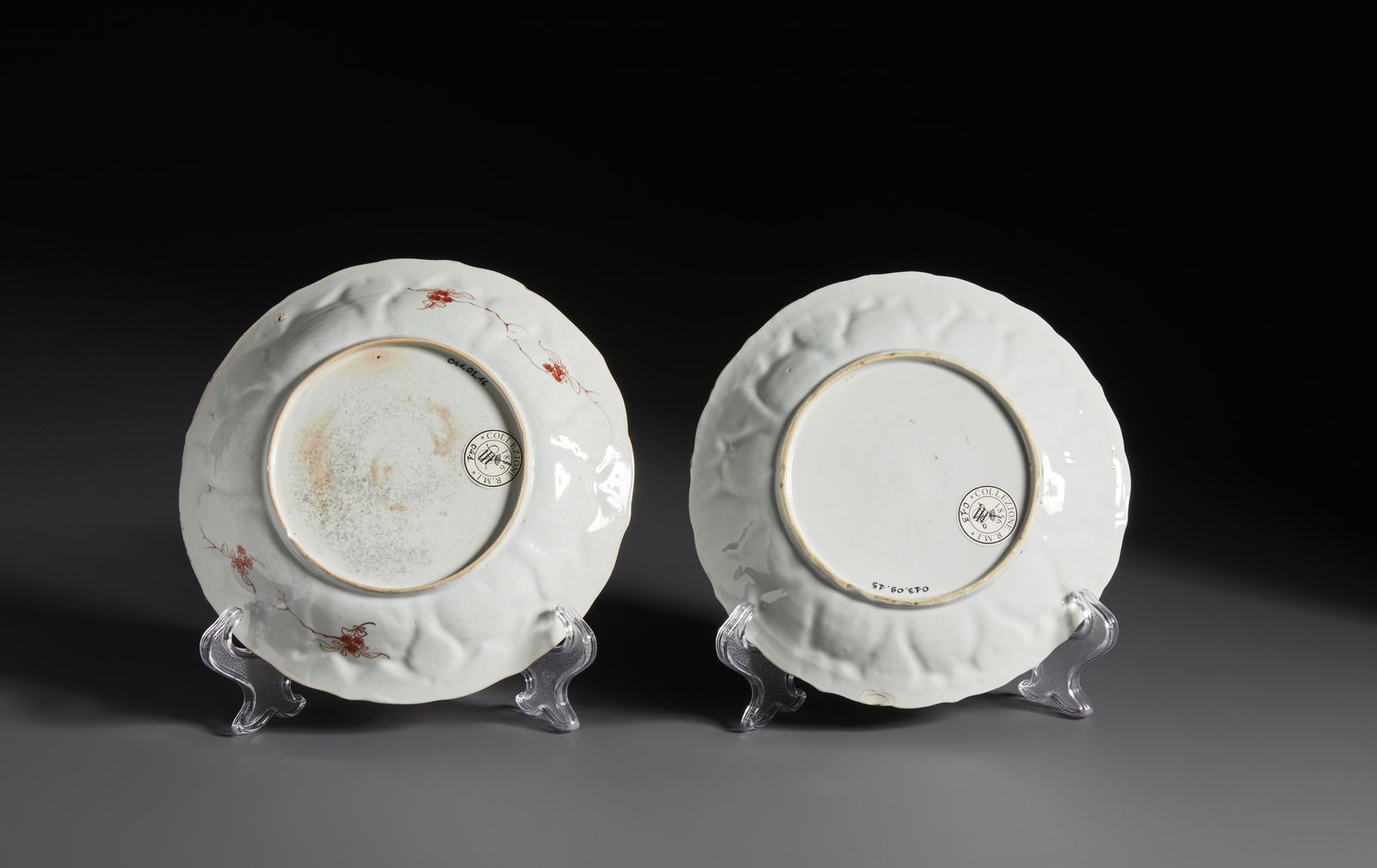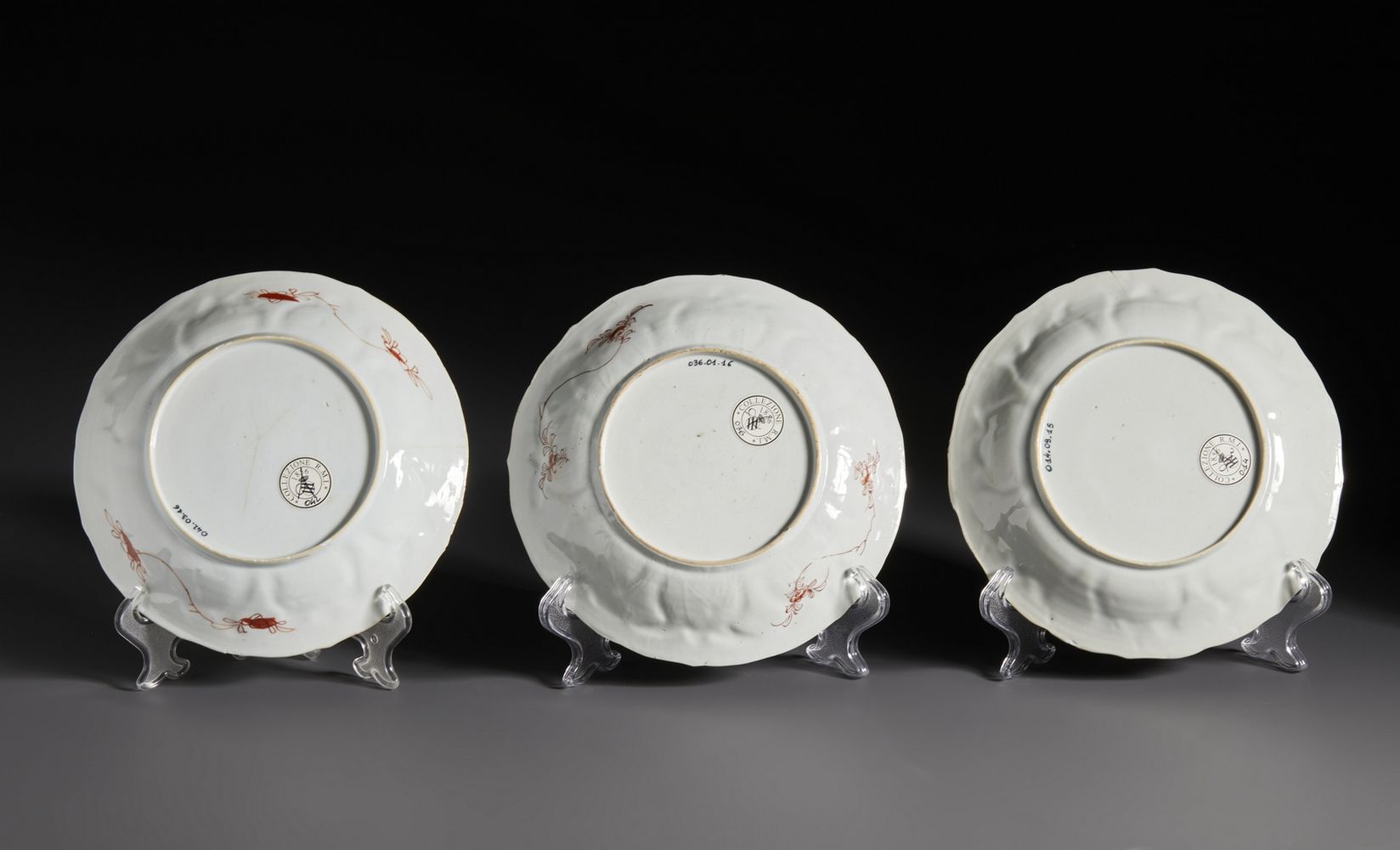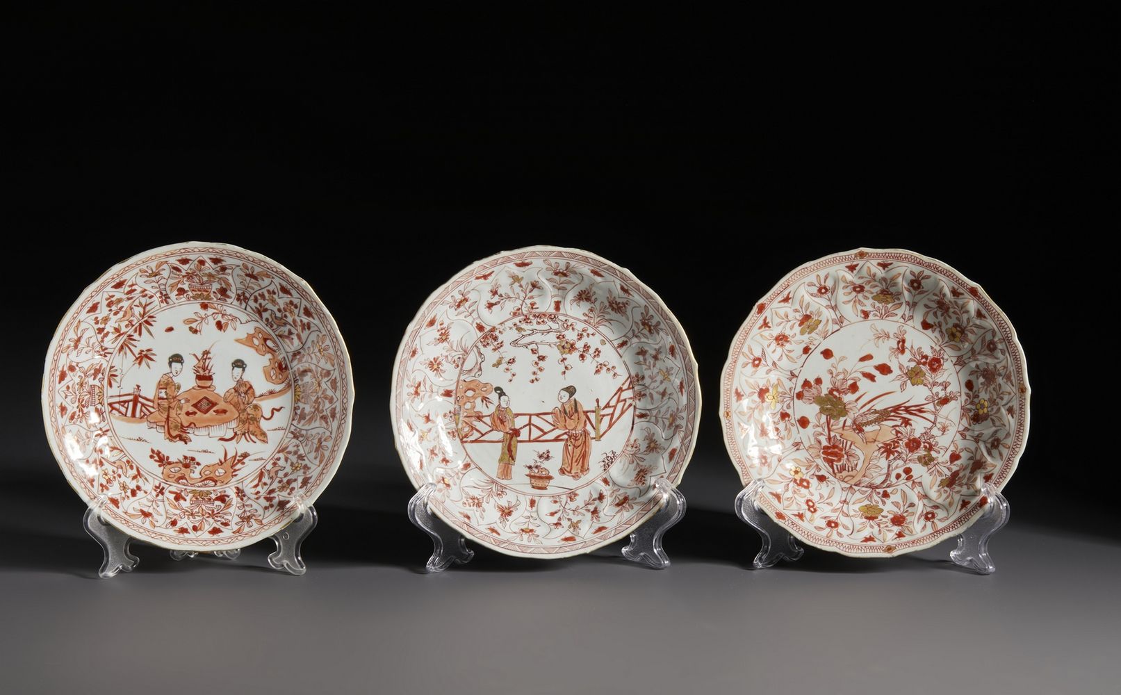 Gruppo di cinque piatti in porcellana decoro “milk and blood” in rosso ferro lumeggiato [..]