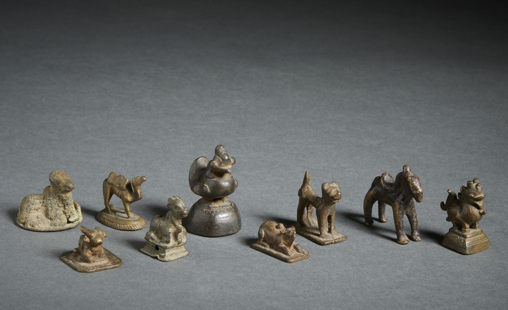 Gruppo di nove pesi zoomorfi in bronzo India, XIX e XX secolo