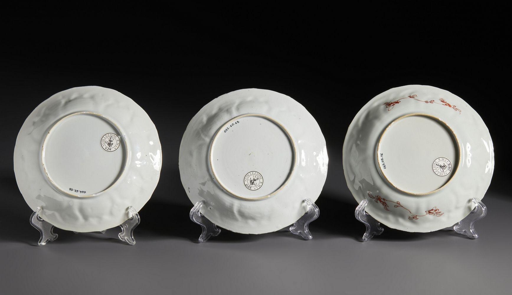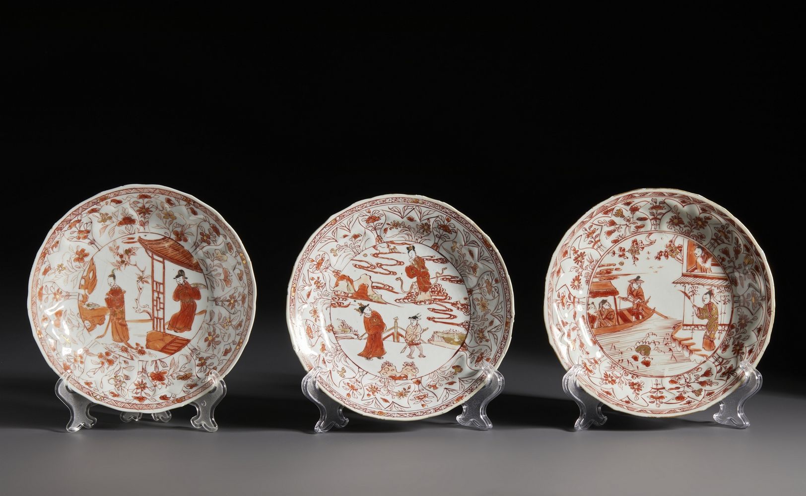 Gruppo di tre bei piatti in porcellana decorati in rosso ferro e oro raffiguranti [..]