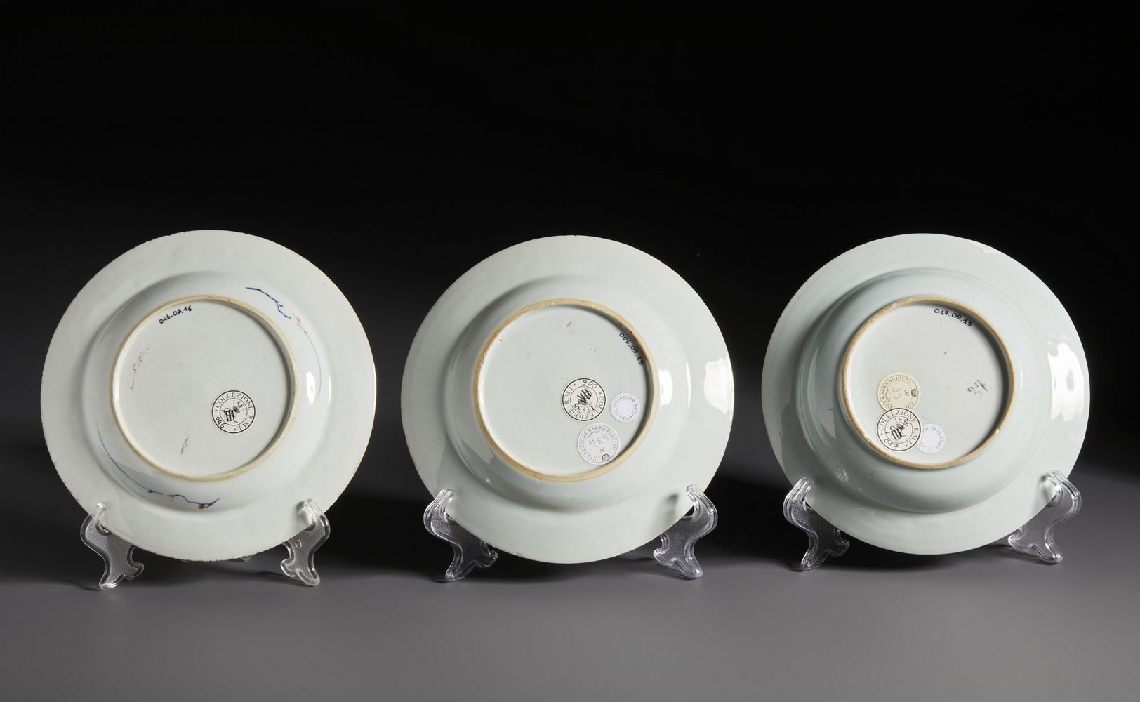 Gruppo di tre piatti in porcellana a decori Imari, due con raffigurazioni di pesci, [..]