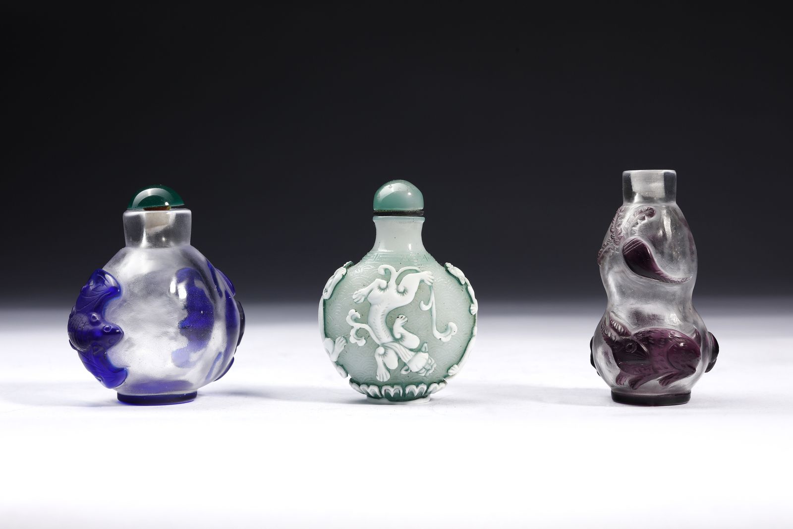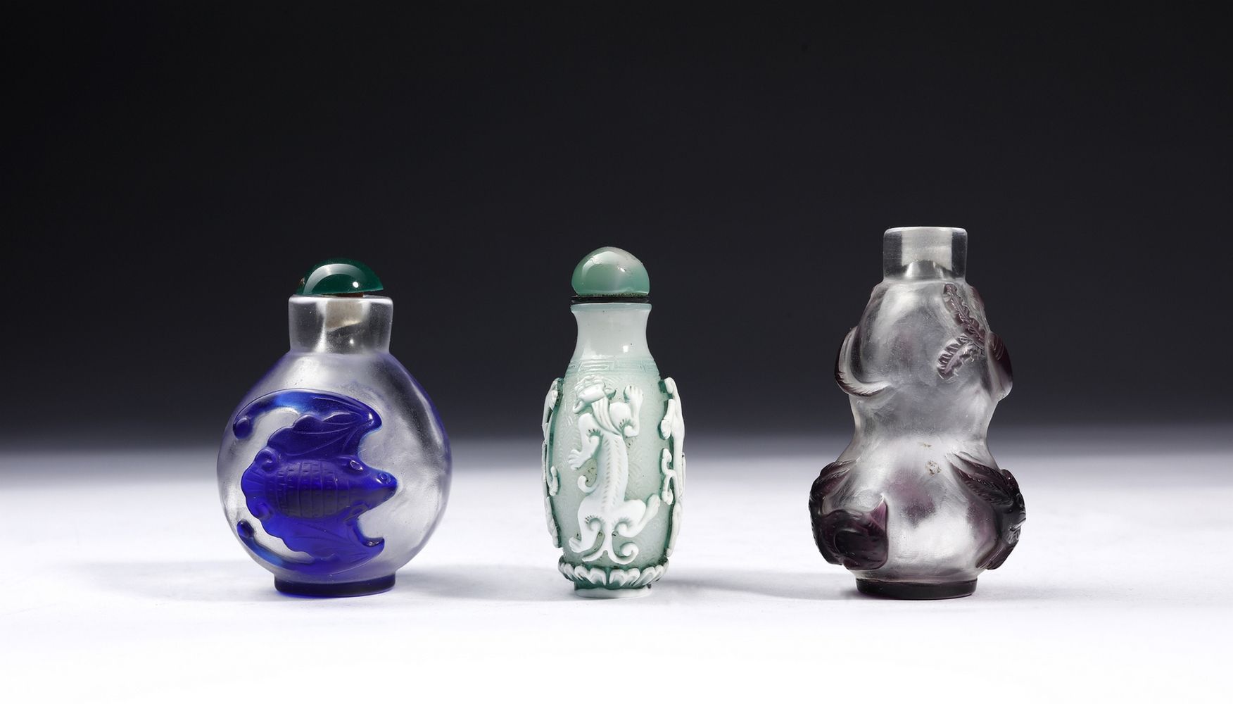 Gruppo di tre tabacchiere in vetro di Pechino Cina, XIX secolo