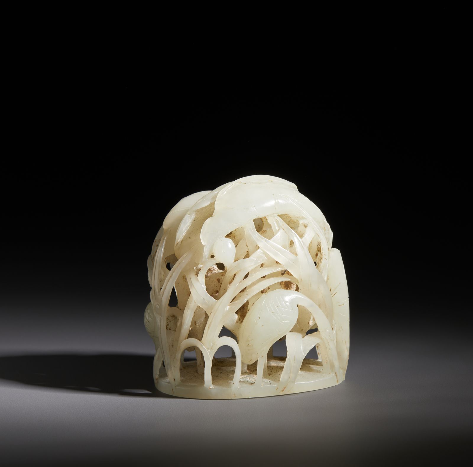 Intaglio in giada bianca elegantemente lavorato, raffigurante scena lacustre con [..]