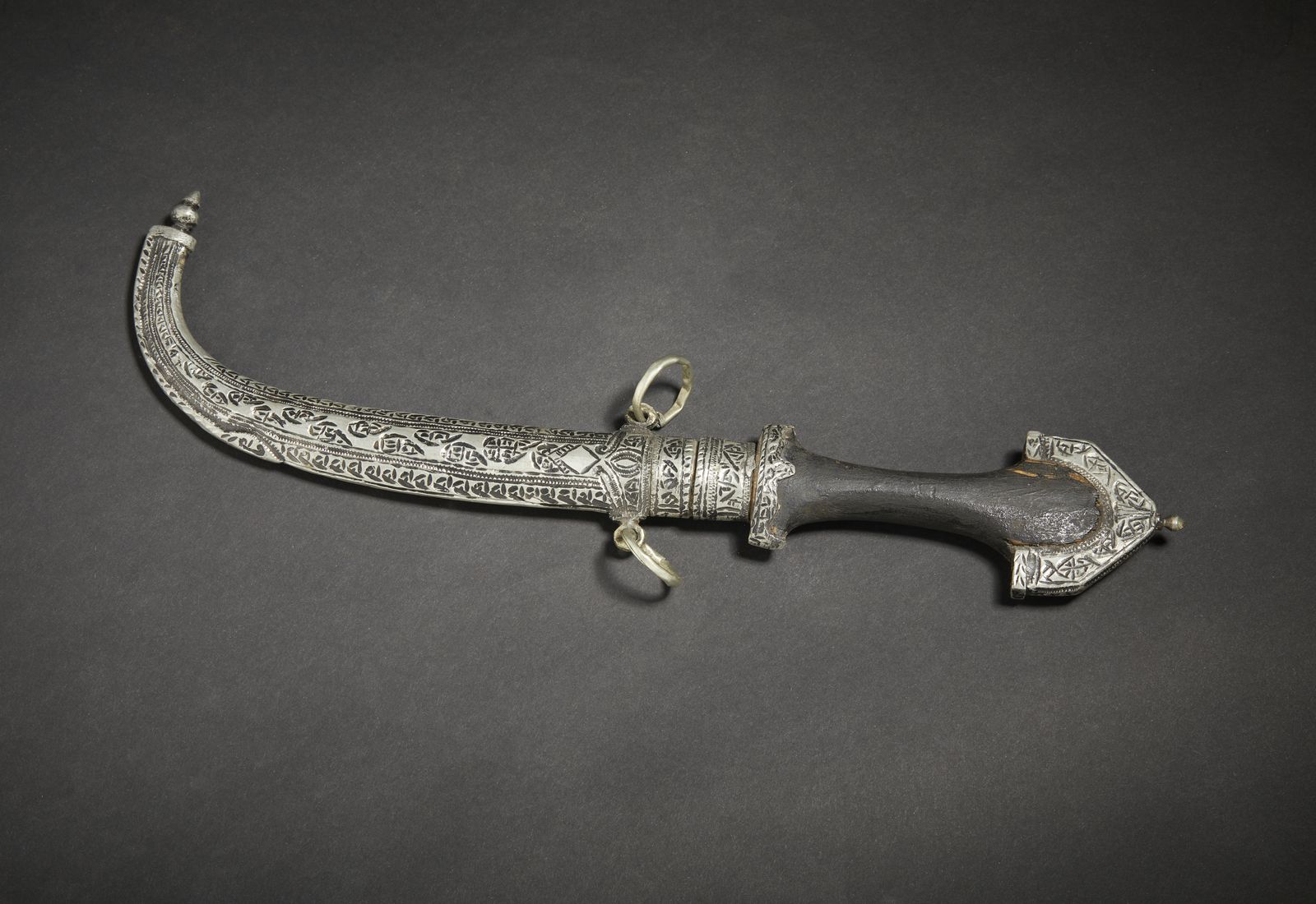 tipico pugnale marocchino a lama ricurva. Il fodero e la parte apicale del manico ligneo in metallo bianco cesellato con disegni geometrici.Provenienza: Collezione Berger.