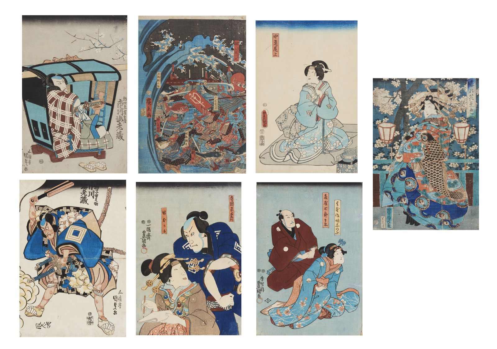 Lotto composto da sette xilografie di vari autori tra cui alcune di Utagawa Toyokuni [..]