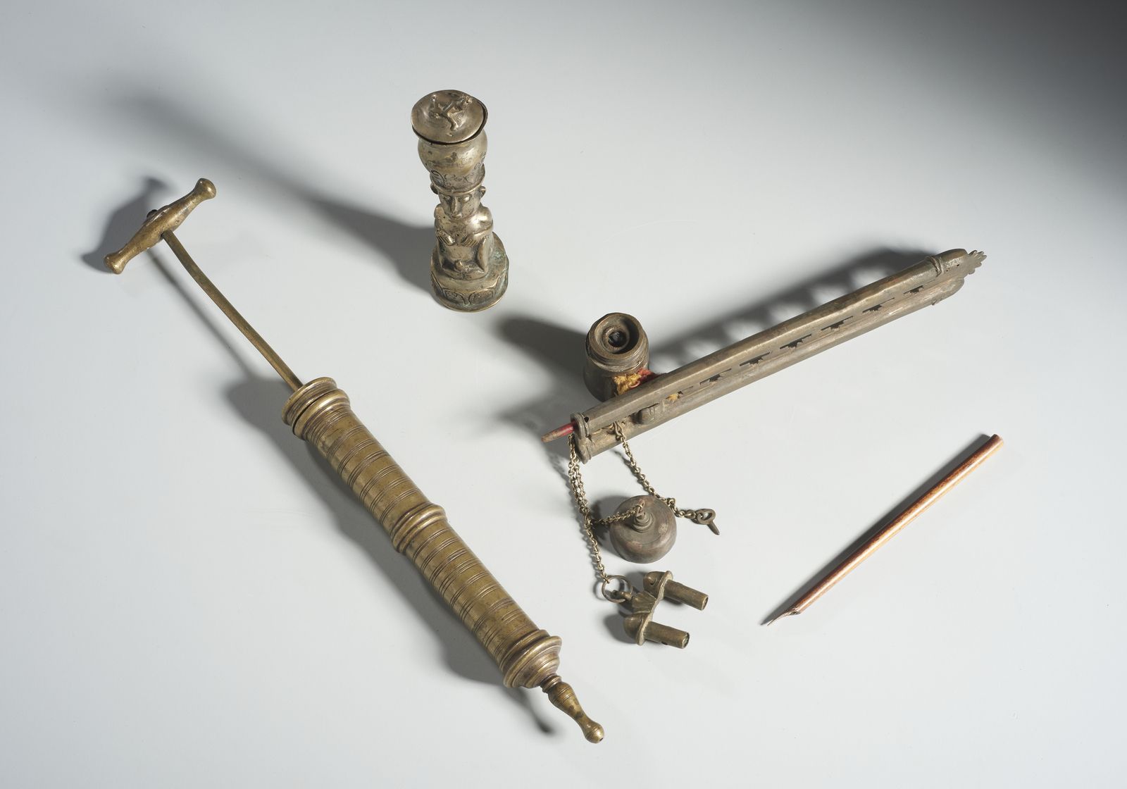 Lotto di tre oggetti: siringa holy festival, contenitore rituale e portapenne. India, [..]