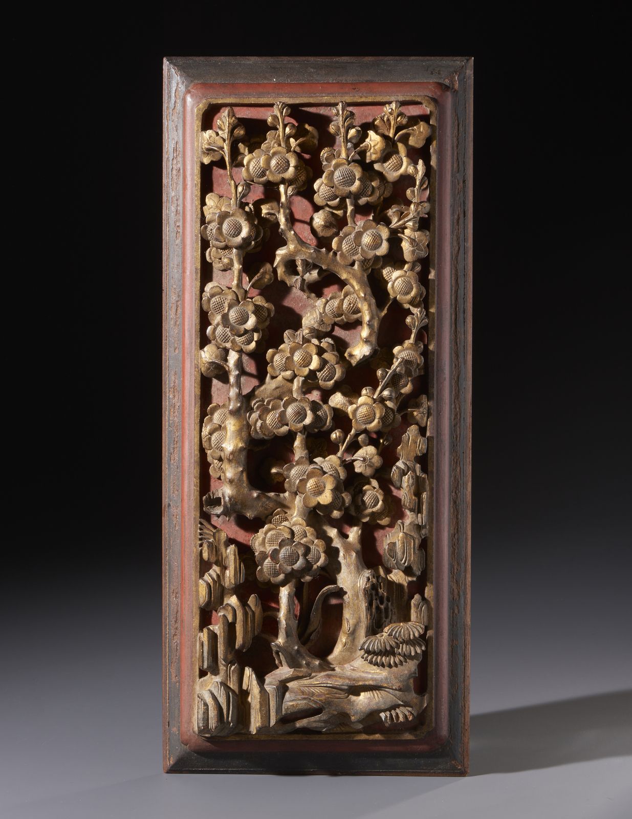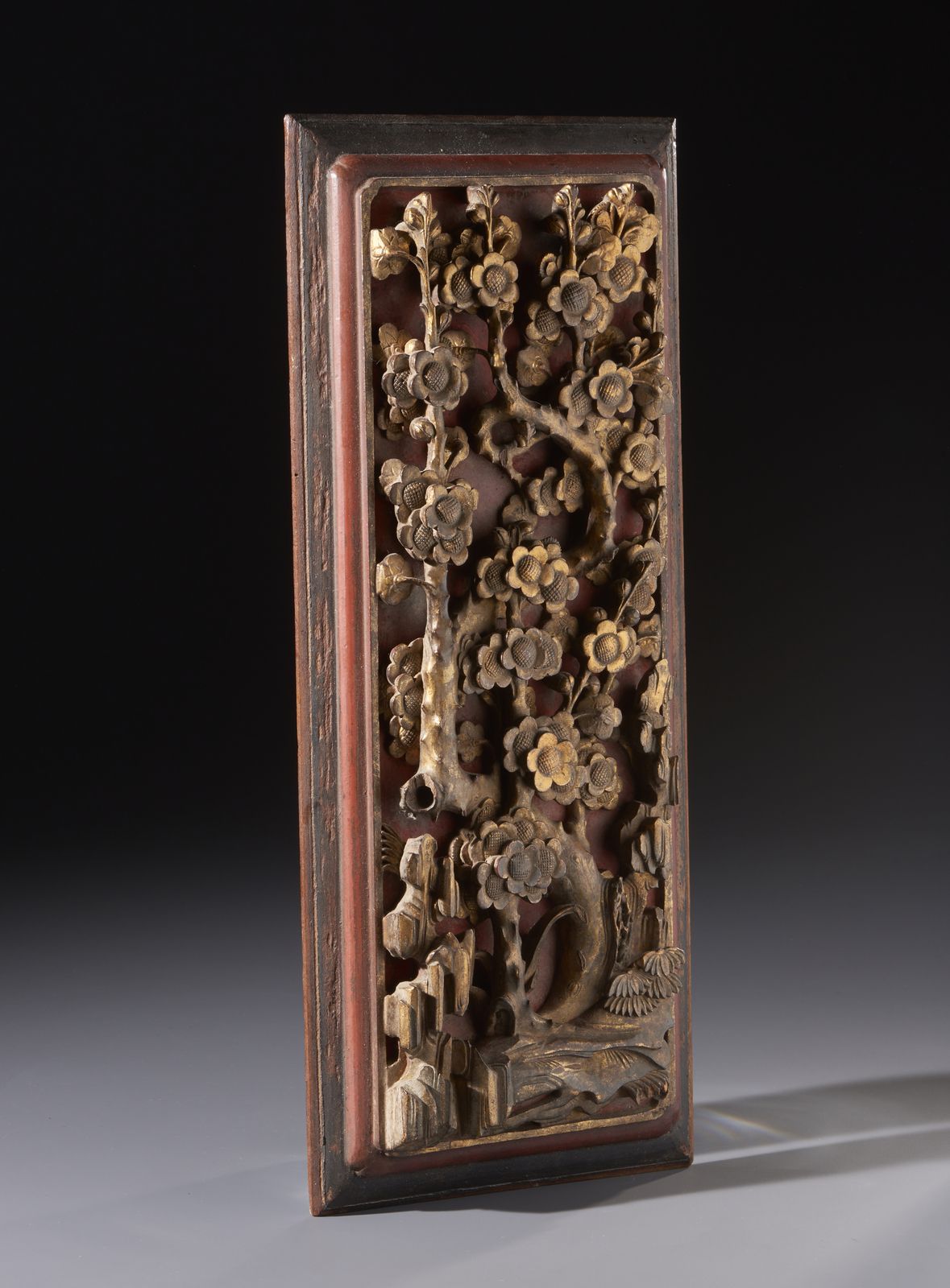 Pannello in legno intagliato, laccato e dorato raffigurante ramo di pruno fiorito.Cina [..]