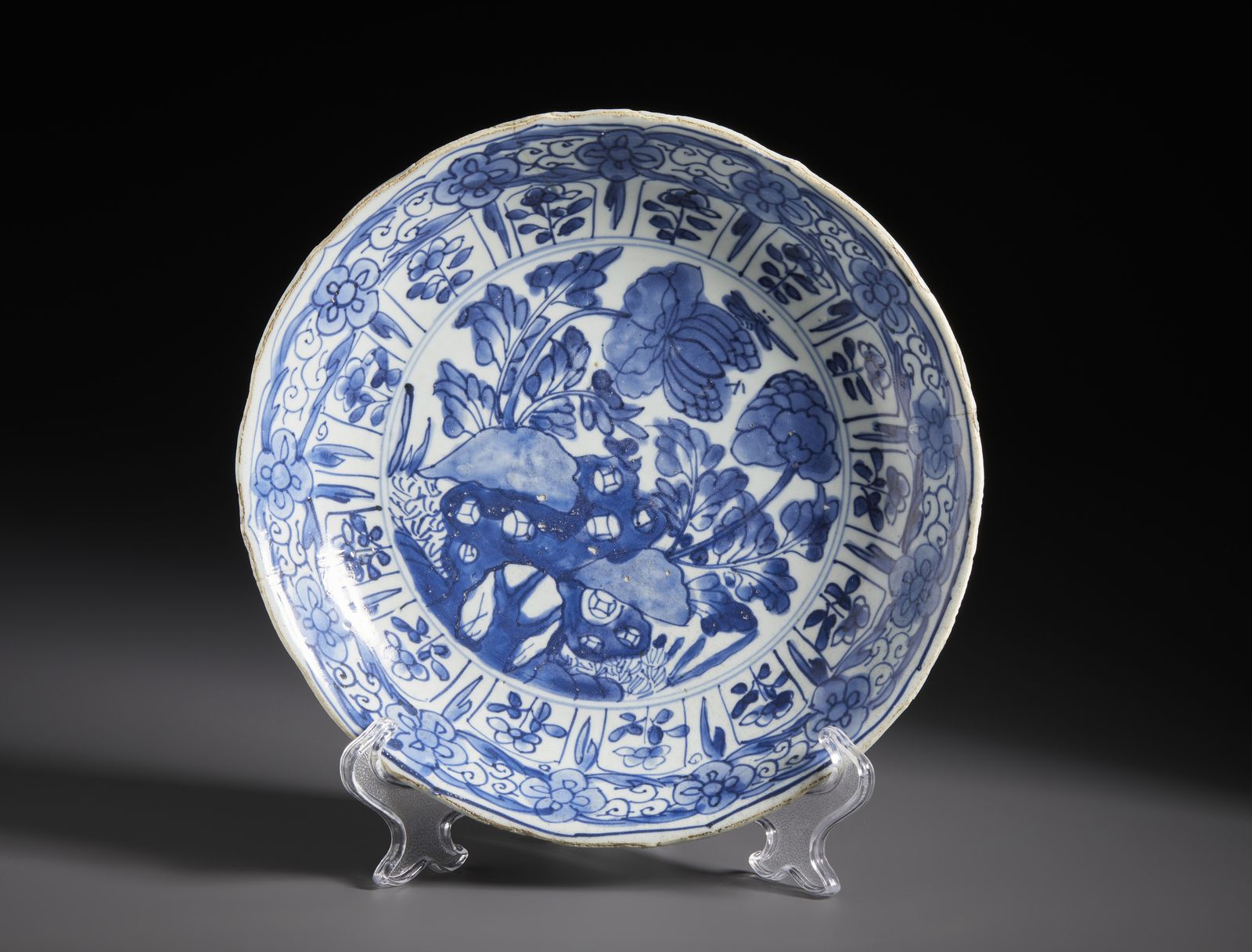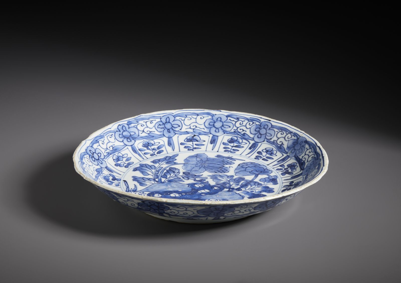 Piatto in porcellana bianca e blu. Cina, Dinastia Qing periodo Kangxi.