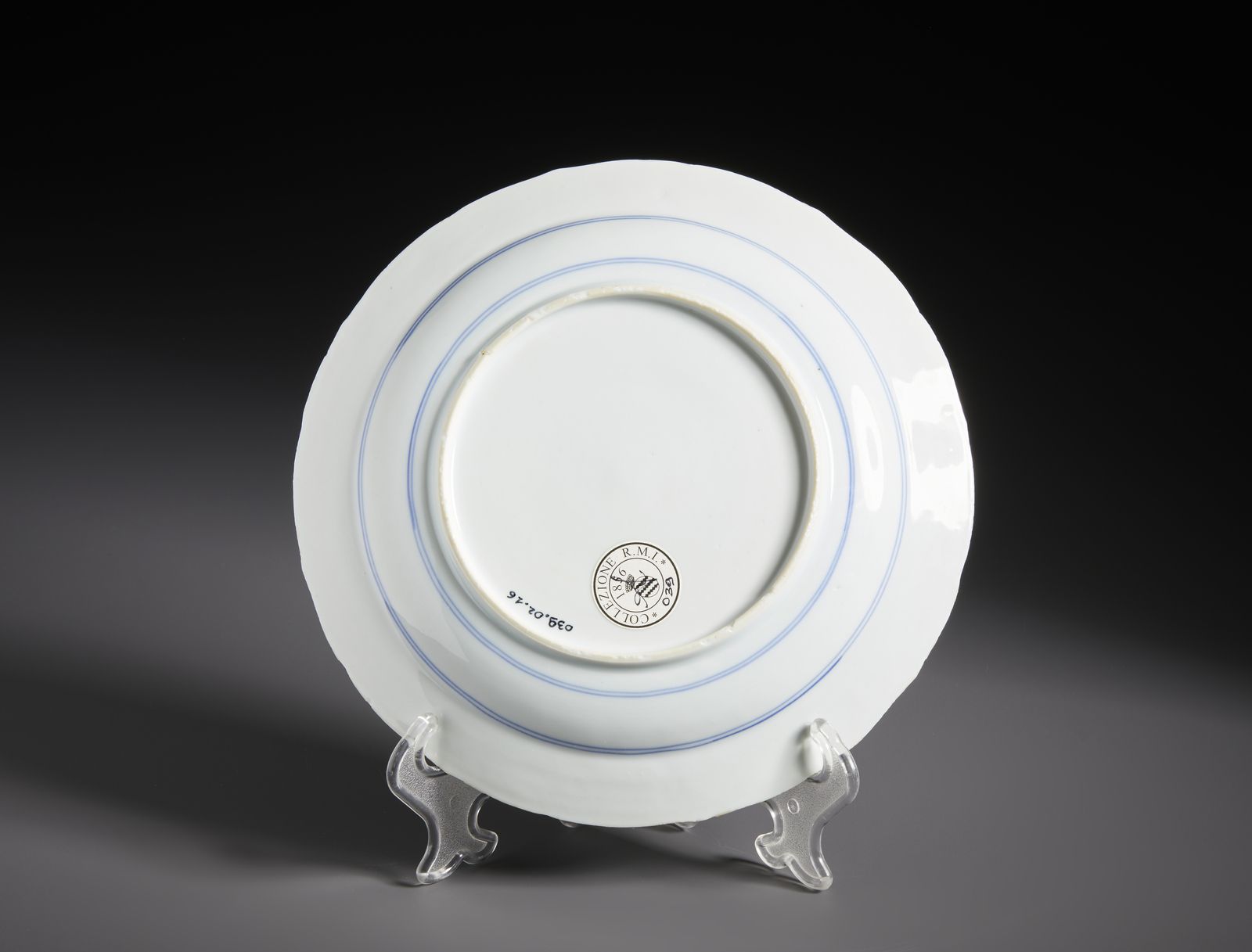 Piatto in porcellana bianca e blu dipinto al centro con uccelli tra rami di fiori.Cina, [..]