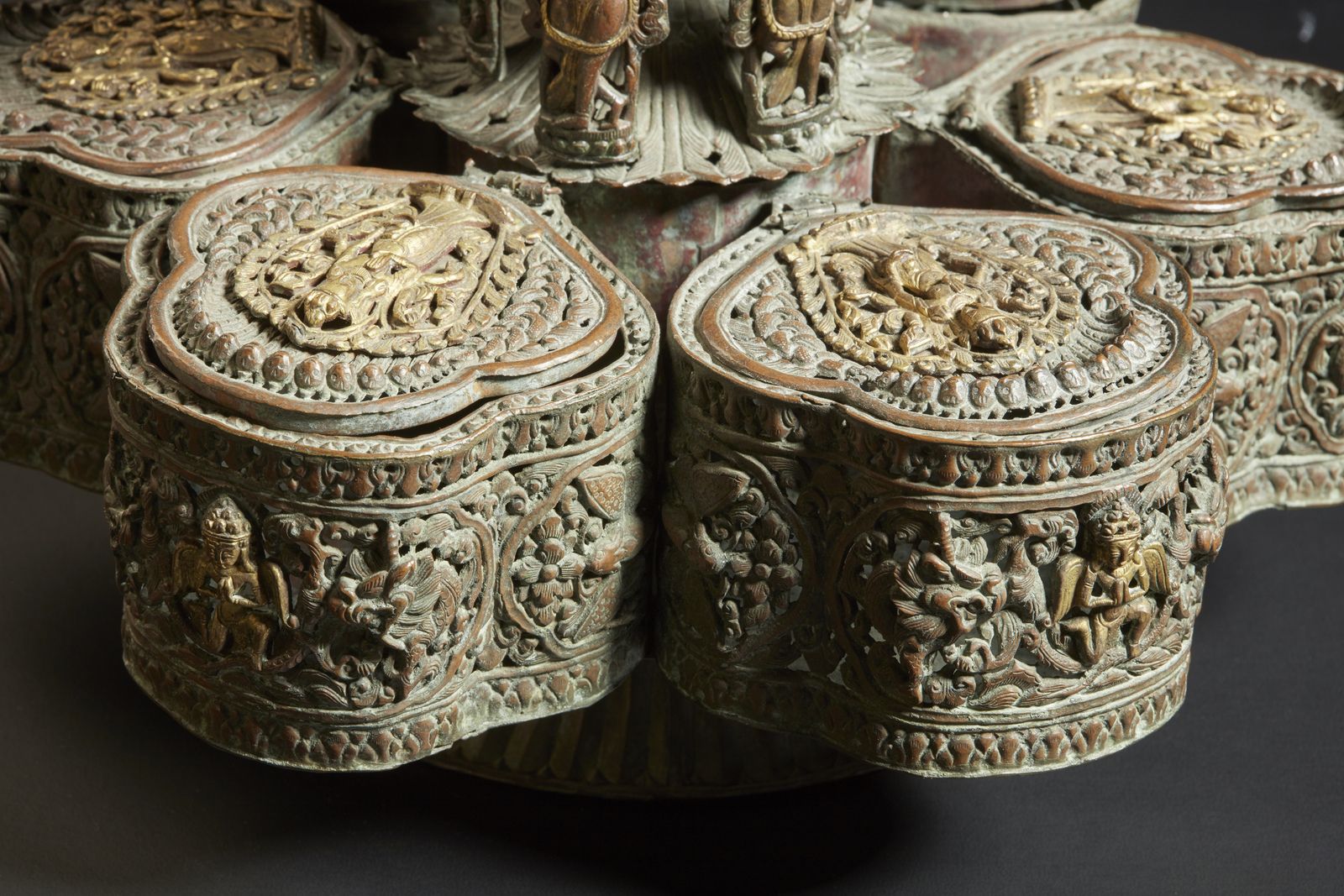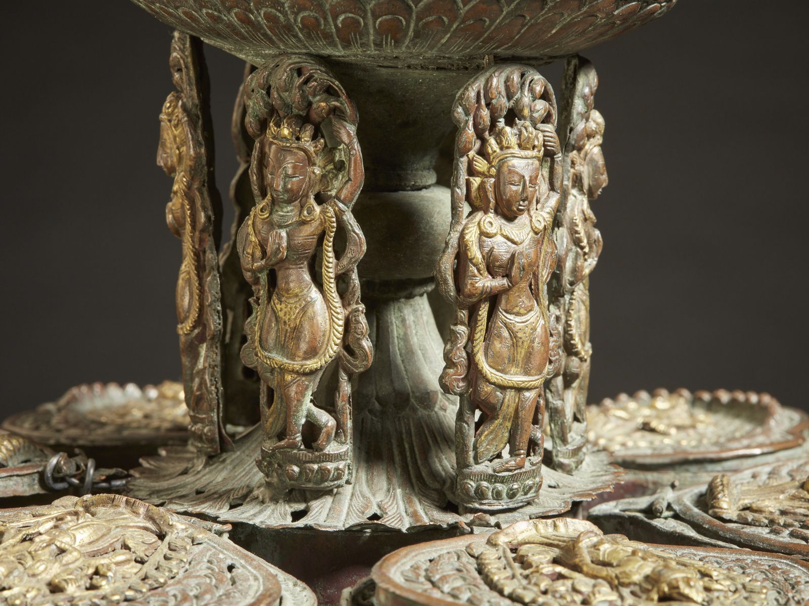 In metallo sbalzato, cesellato e lavorato a traforo, composto di numerosi scomparti a forma di goccia con coperchio incernierato, probabilmente atti a contenere le spezie. L'esterno decorato con tralci vegetali intrecciati e piccole placche contenenti divinità sincretiche, come il personaggio alato inginocchiato che ricorda Garuda. Cariatidi simili aYakshni ricoprono lo stelo centrale e la sommità è decorata con elemento fiammeggiante contenete la raffigurazione del Buddha della Medicina entro prabha tricuspide.